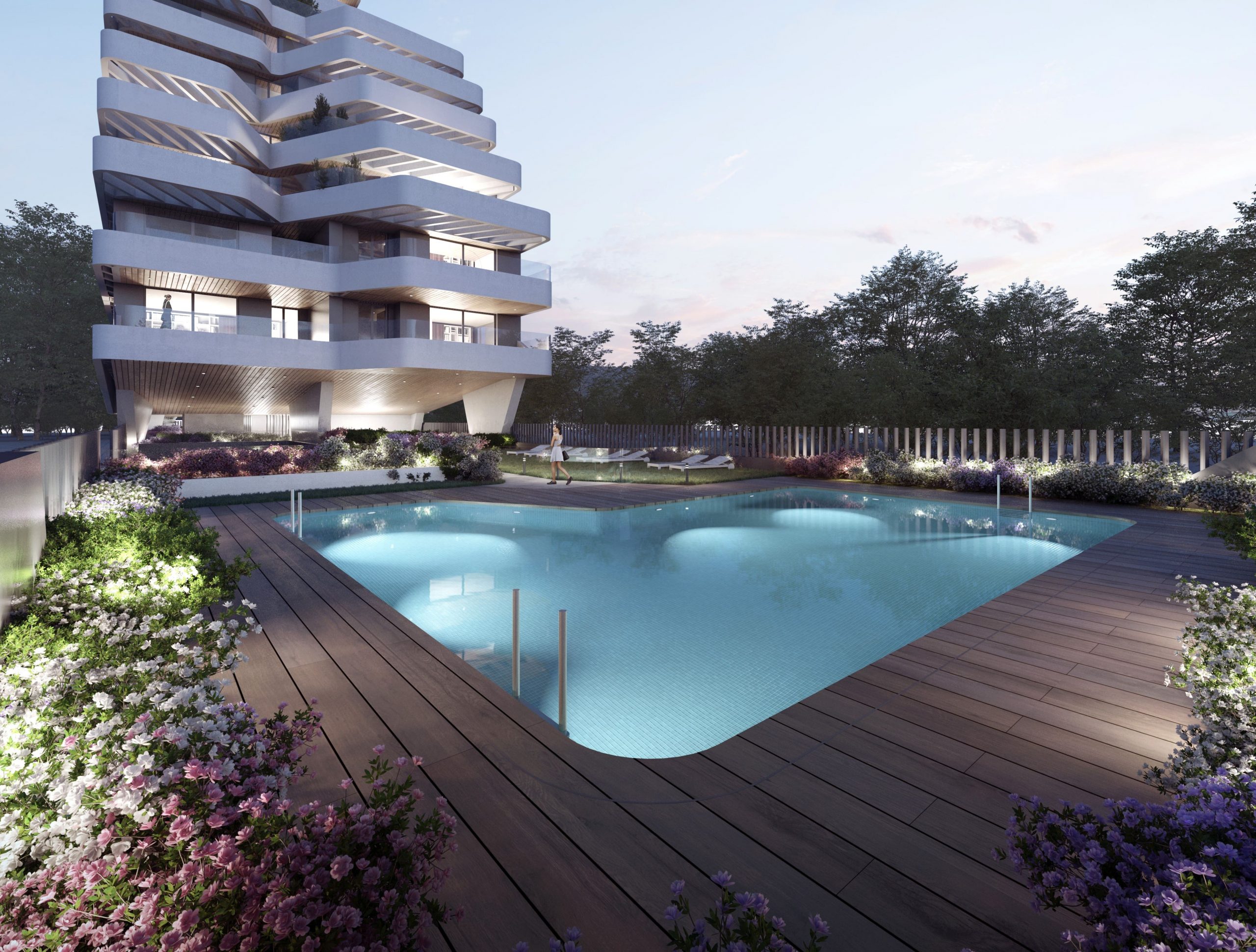 El edificio ha sido concebido con un diseño aterrazado que dota a las viviendas de amplias terrazas privadas y permite disfrutar de vistas privilegiadas al skyline de Madrid, integrando el confort con el entorno urbano de forma elegante y funcional.