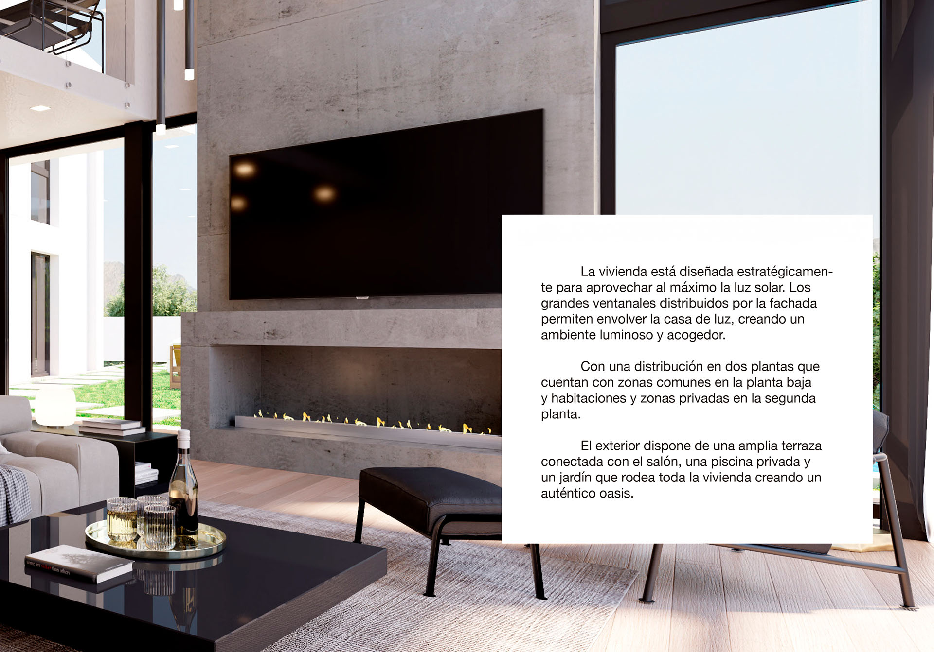 Entre las opciones disponibles se encuentran una piscina y jardín. Los acabados han sido seleccionados cuidadosamente para ofrecer confort y durabilidad, con pavimento de gres porcelánico rectificado o pavimento continuo de altas prestaciones. Los revestimientos verticales son de pintura plástica en todas las estancias y los locales húmedos cuentan con paramentos revestidos. Los falsos techos tipo Pladur tienen un acabado en pintura plástica.