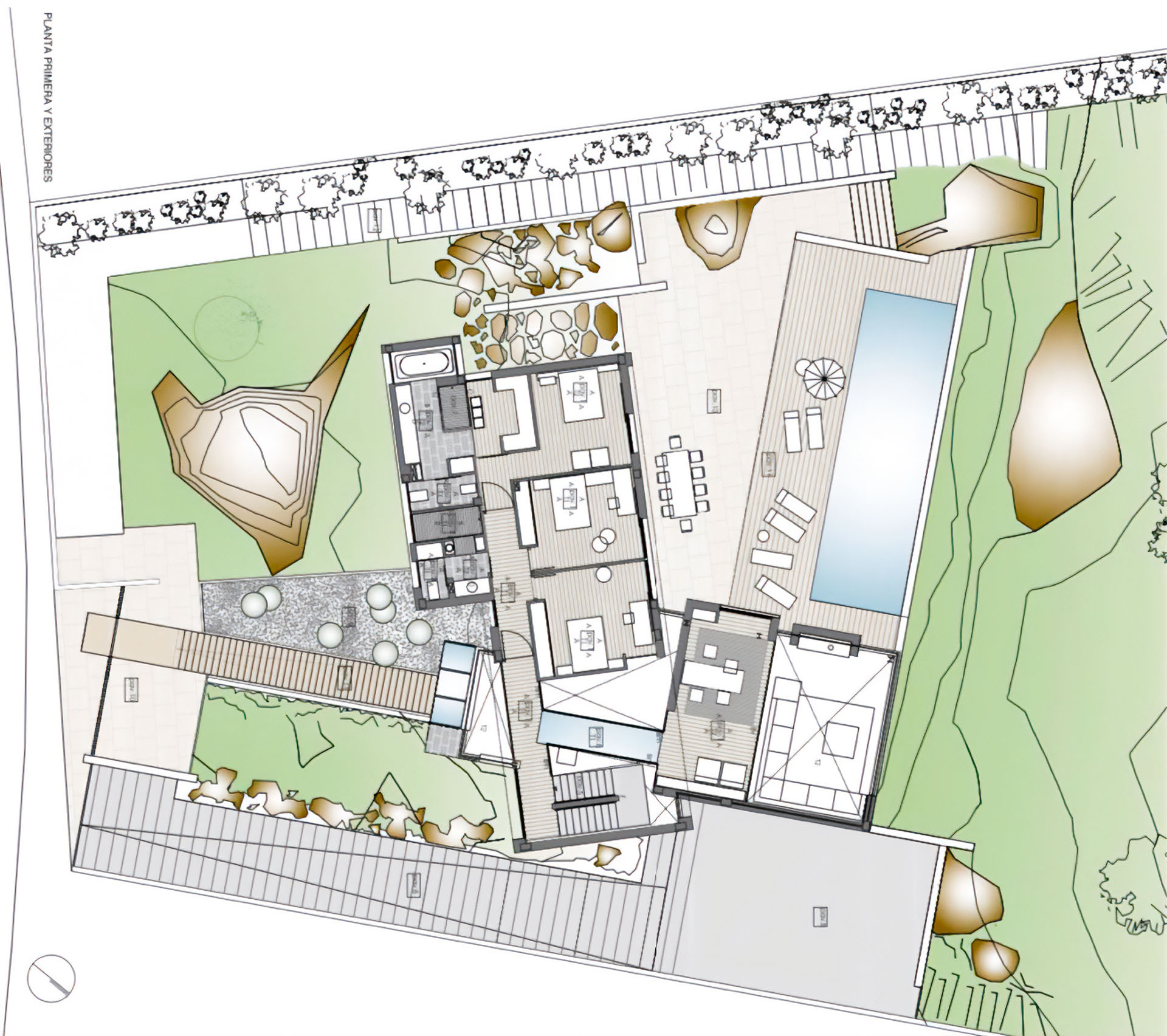 La vivienda se compone de dos volúmenes, uno paralelo al vial de acceso y otro articulado con el primero. El primer volumen cuenta con dos alturas, en la planta baja se encuentran las zonas de cocina, comedor y habitación principal con baño y vestidor, cuarto de plancha y aseo, mientras que en la planta primera se ubican las zonas privadas con 3 dormitorios y dos baños. El segundo volumen también consta de dos alturas y un sótano, con zonas comunes en la planta alta y garaje para 2 vehículos, gimnasio y bodega en la planta sótano.