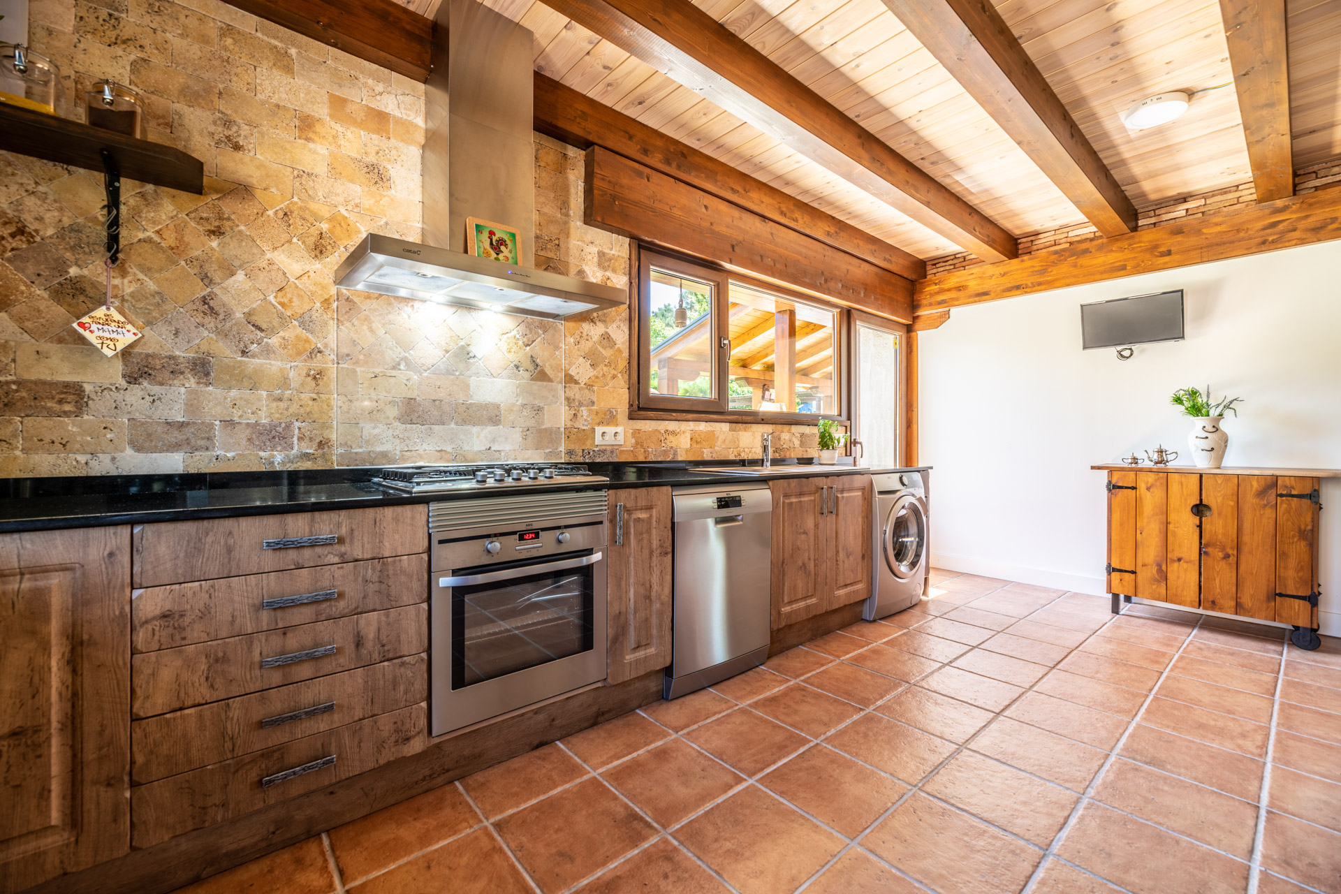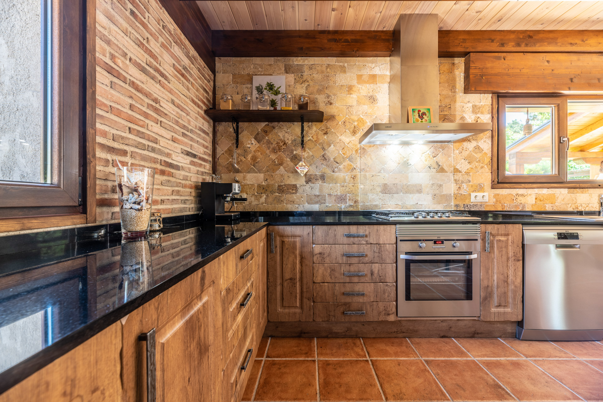 En planta baja nos encontramos un salón espectacular y grande diseñado en concepto abierto y semiintegrado con la también amplia cocina. Ambos espacios con accesos directos a la zona del jardín. Con una tremenda luz gracias a sus muros compuestos en gran parte de enormes ventanales con cristales especialmente diseñados para evitar perdida de temperatura. La COCINA, sí en mayúsculas, será un lugar idóneo para los/las cocinillas de la casa. Y es que, poder preparar un suculento plato en los fogones de gas profesional, mientras divisamos la vegetación, será todo un lujo en Mayúsculas para un auténtico Chef. En esta misma planta también contamos con 2 dormitorios y baño completo que sirve como aseo de cortesía.