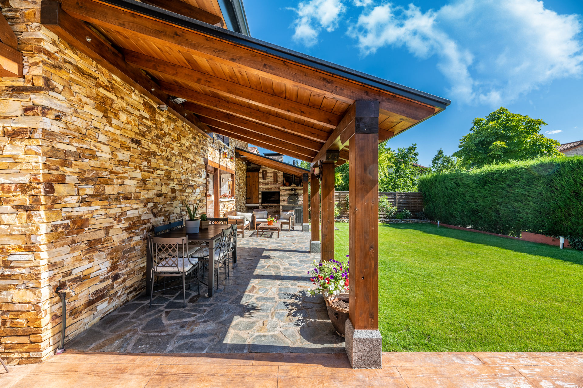 El jardín cuenta con amplio espacio de esparcimiento y varios lugares a la sombra donde sentarse a disfrutar del silencio de la propia naturaleza. El lateral derecho de la casa está ideado para crear en un futuro una piscina de obra, además ya está hecha la ducha. En esta misma zona tenemos la Barbacoa de obra y Horno de Leña junto al porche cubierto, el cual, se convertirá en el lugar idílico para celebraciones y comidas con familiares y amigos.