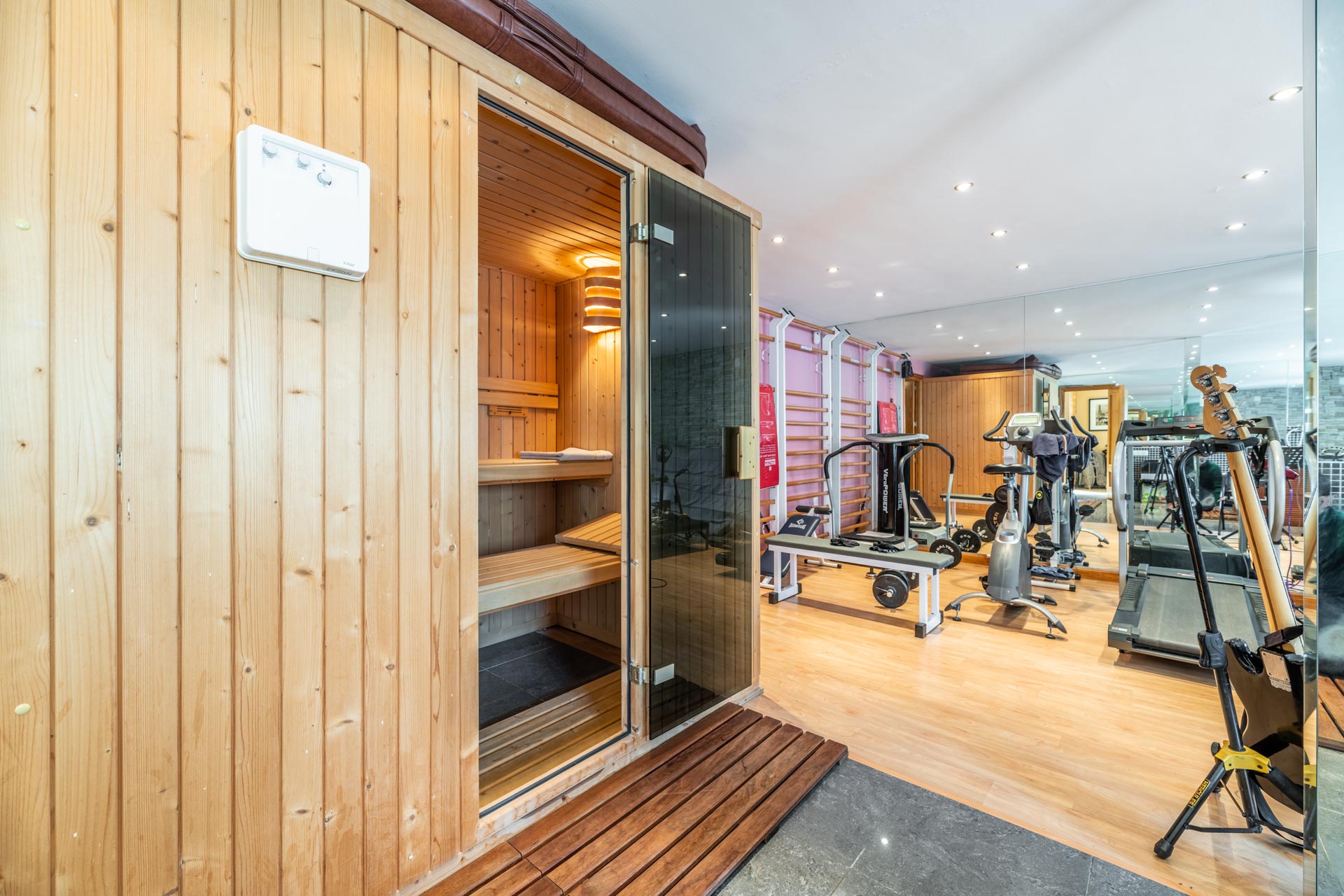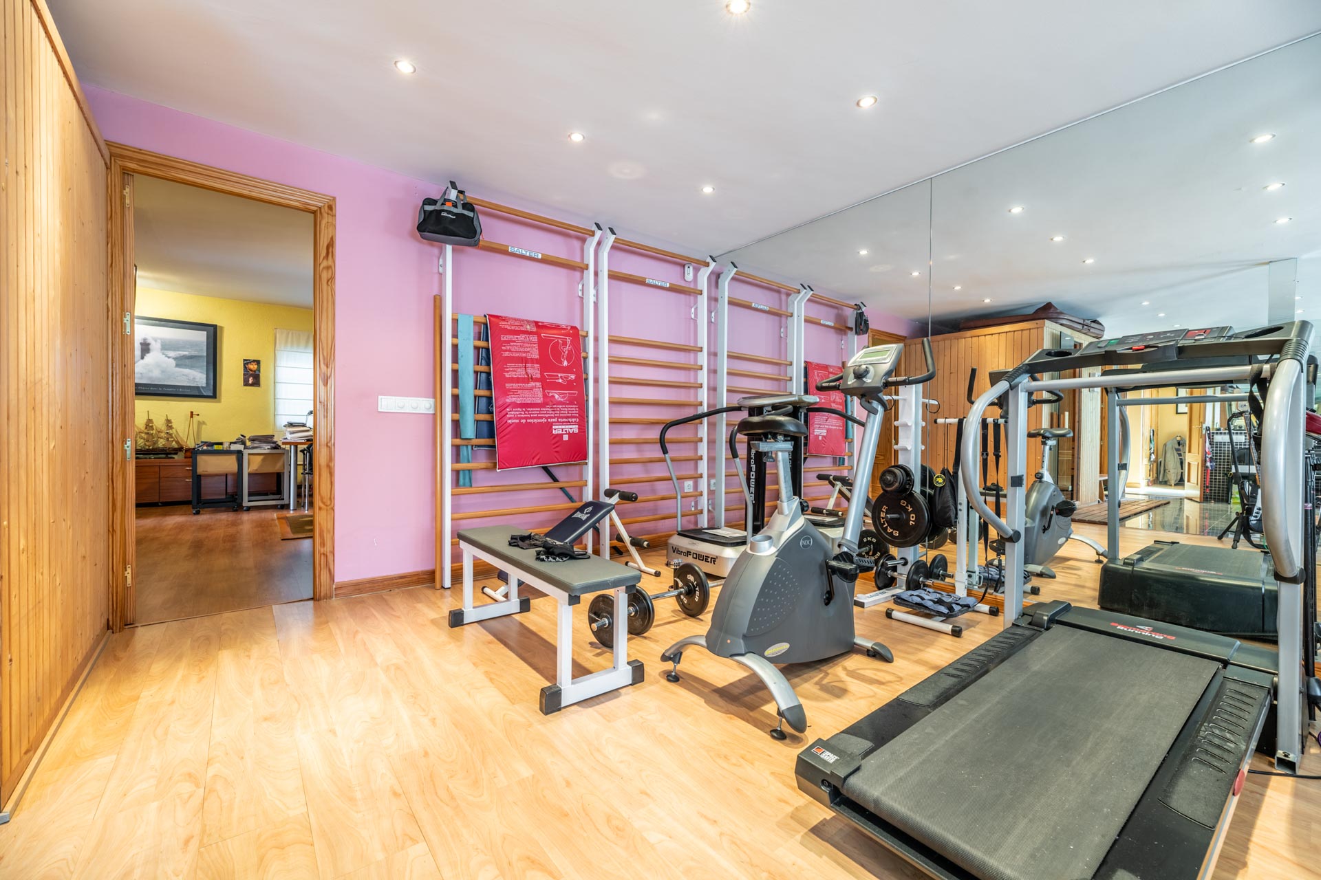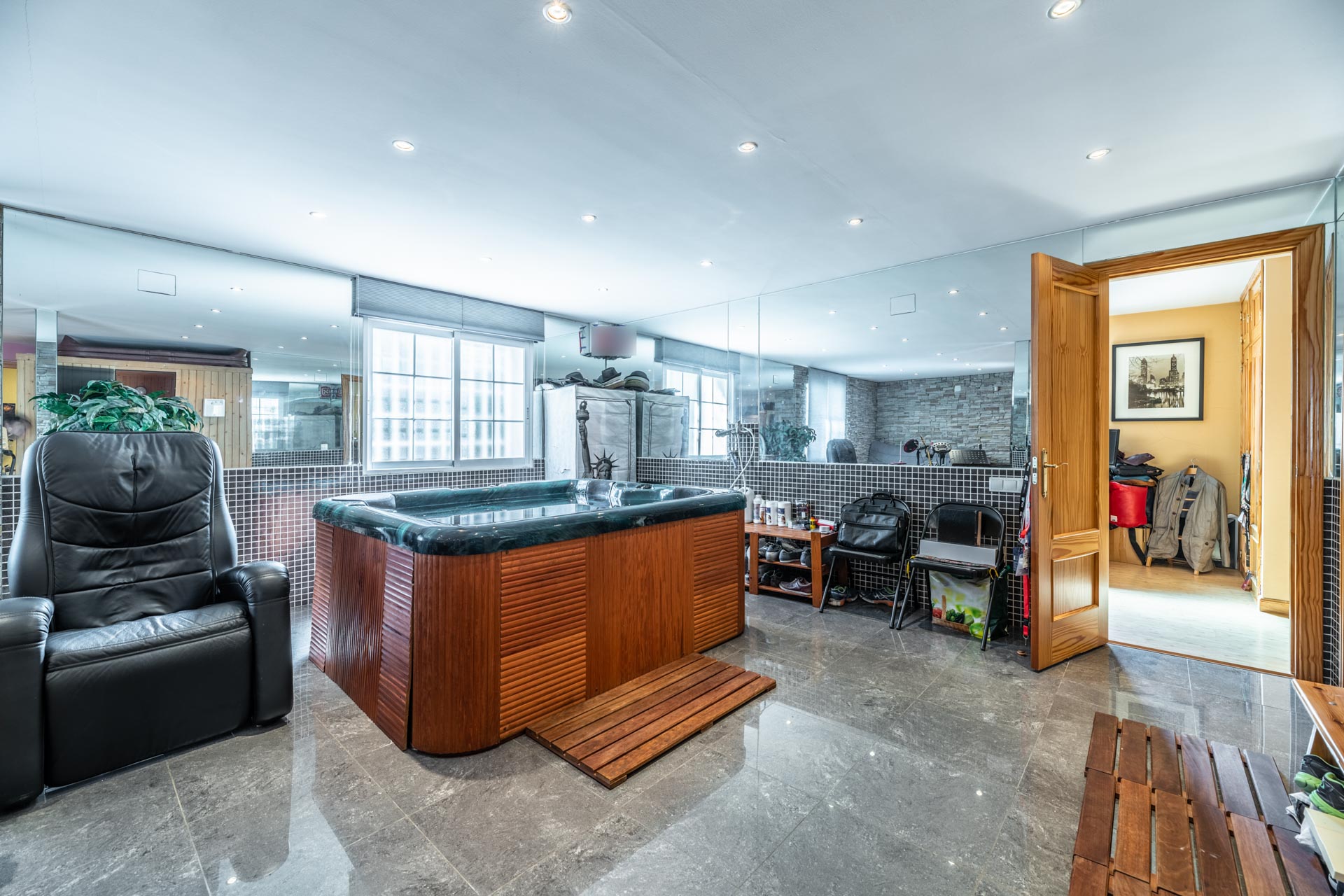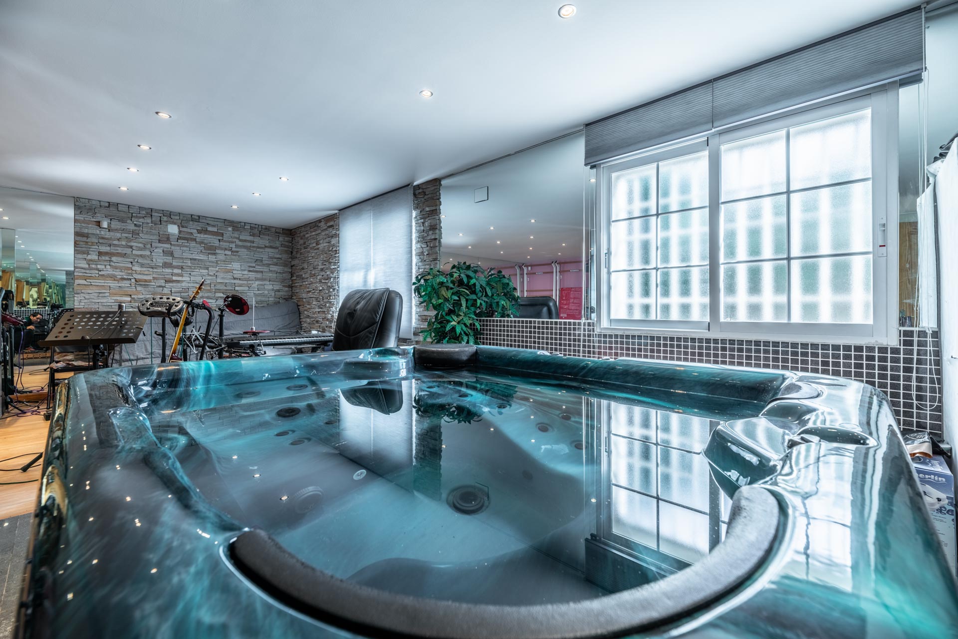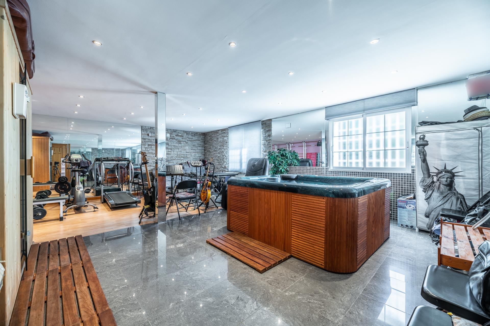 La planta baja se encuentra totalmente en la superficie, de modo que todas las estancias cuentan con grande y luminosos ventanales. Esta planta es el capricho de la casa. Una zona Wellness donde encontrarás desde un Gimnasio totalmente equipado, hasta una Sauna Finlandesa y un Jacuzzi para 4 personas totalmente nuevos. Esta misma zona wellness dispone de un espectacular y amplio baño. Incluso, también tienes una zona recreativa donde montar tus pequeñas fiestas con música, Billar, Futbolín, Diana Electrica, etc…