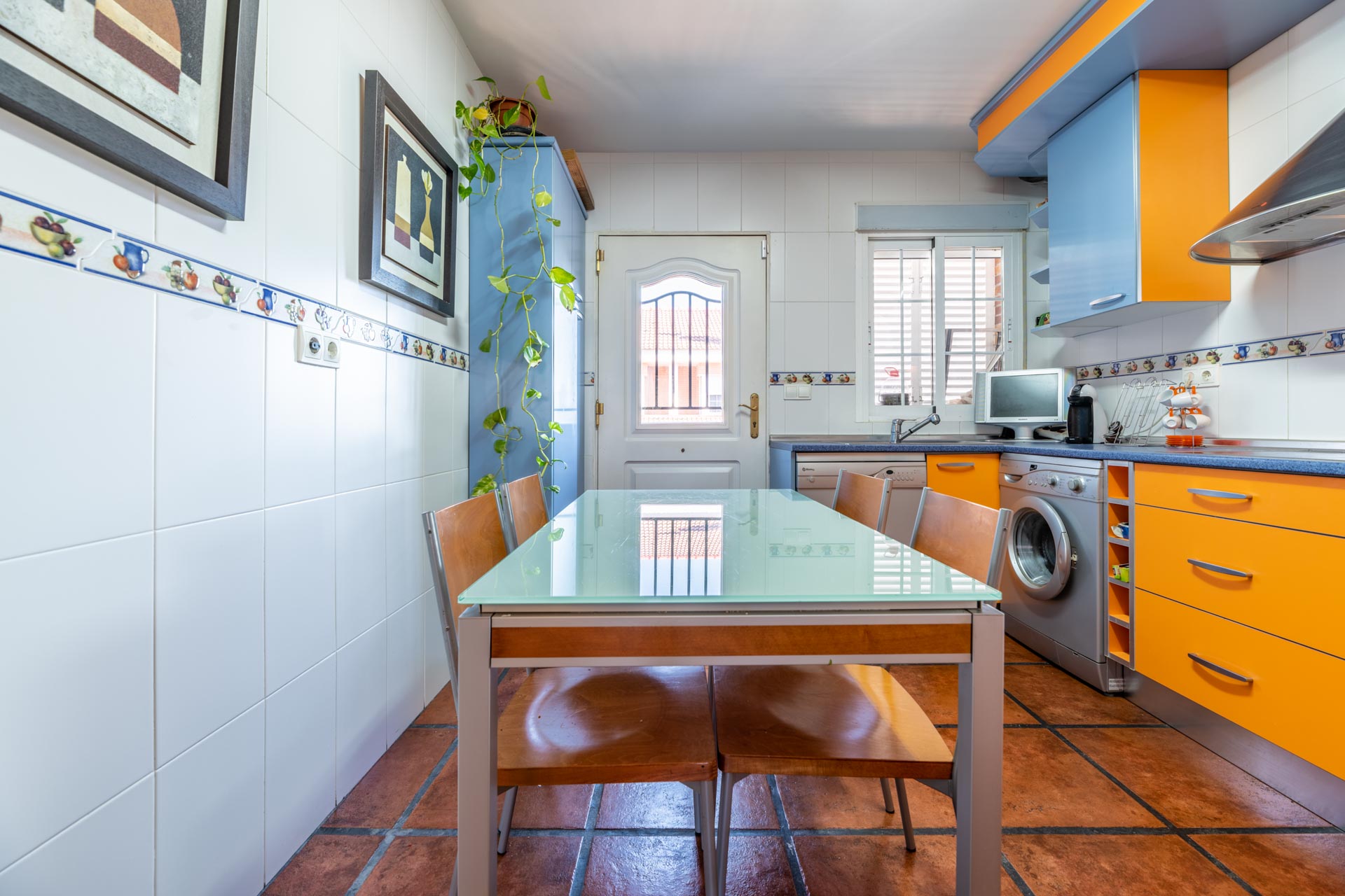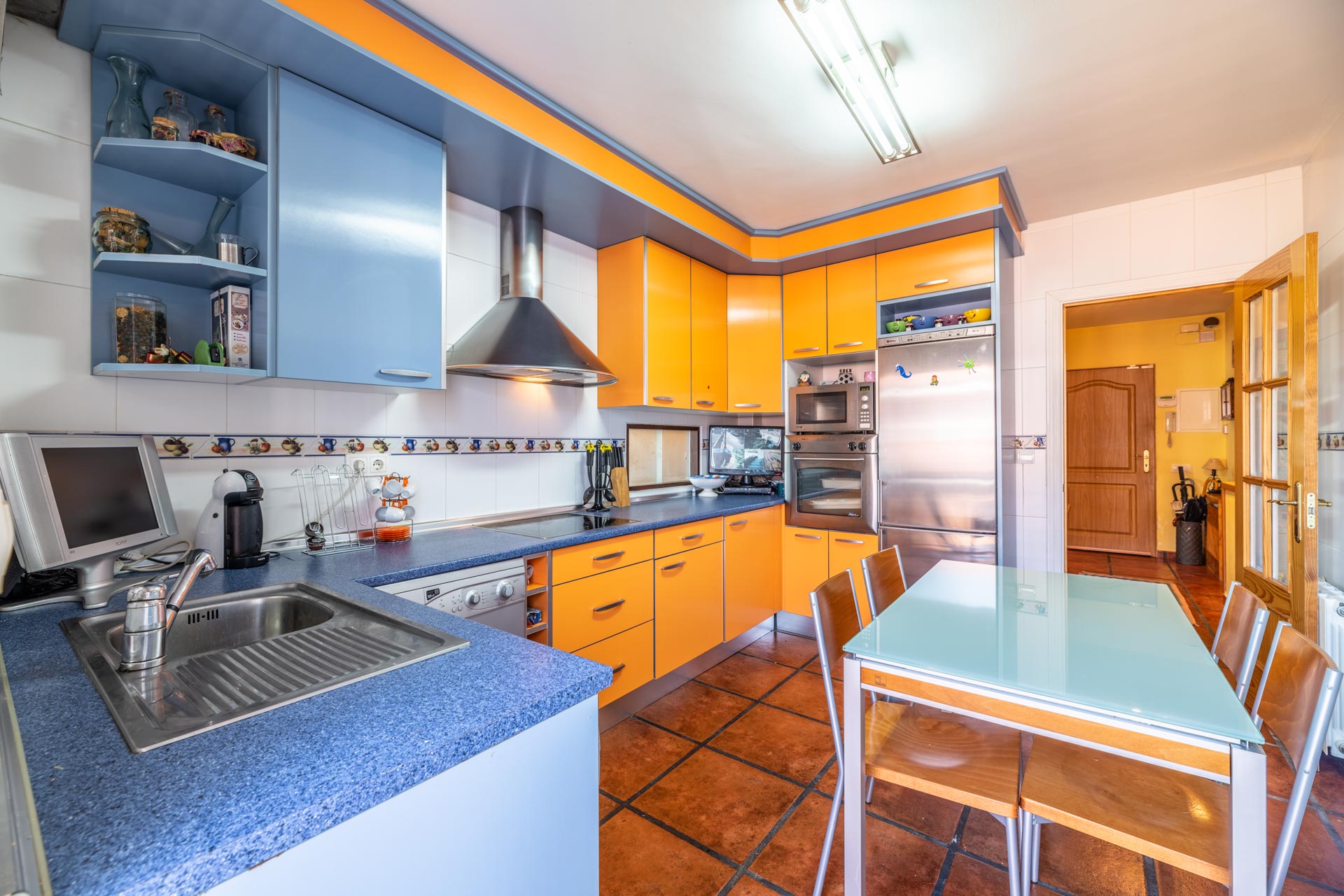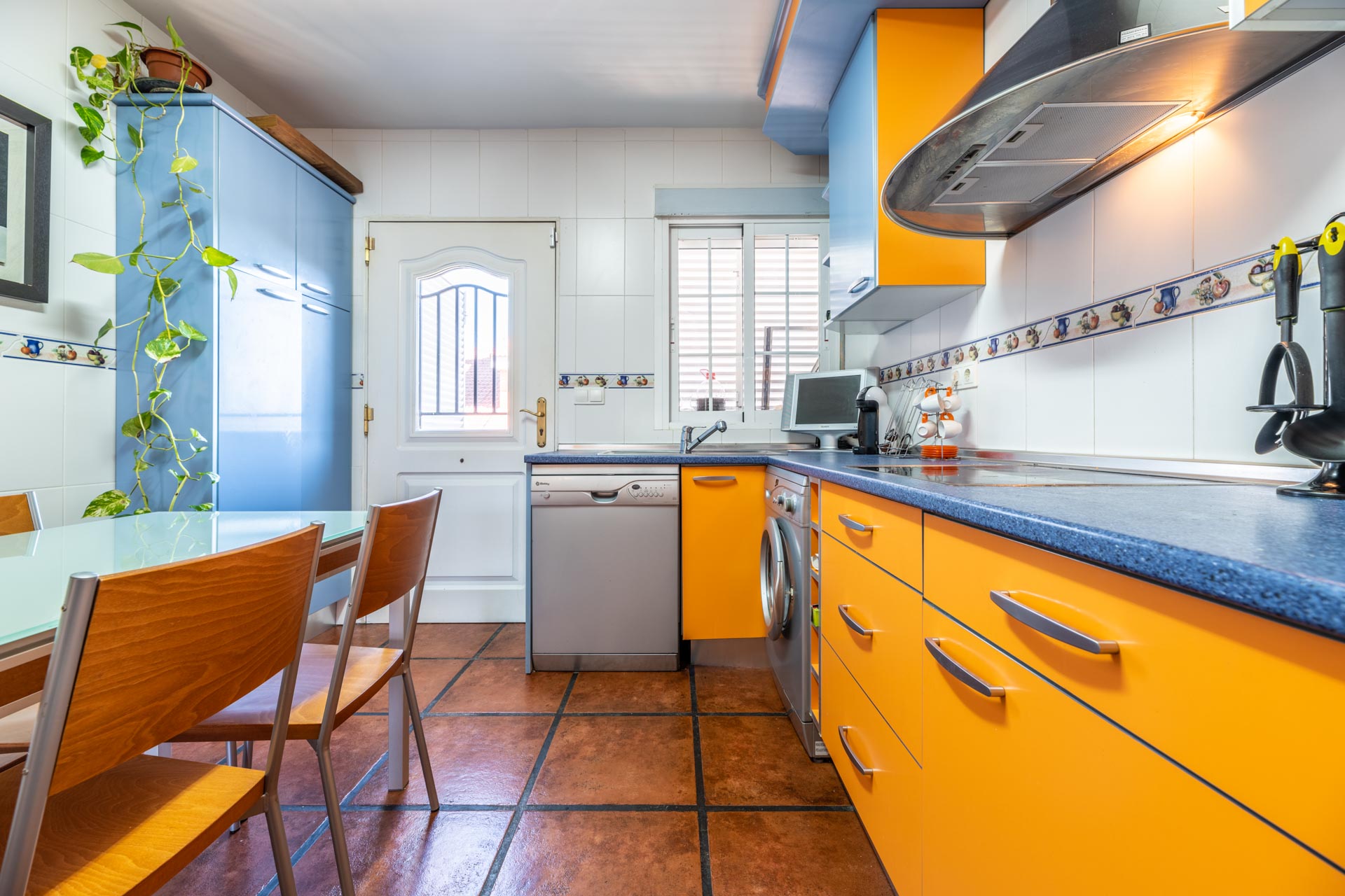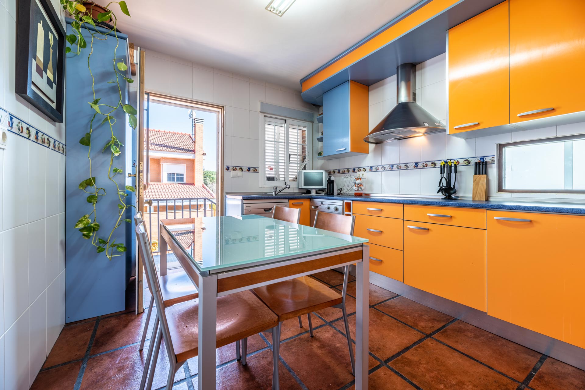 En esta misma planta, tenemos una espaciosa cocina comunicada con el salón por una ventana para facilitar el traslado de platos al comedor. Desde aquí, así como a través del móvil, podemos controlar el circuito cerrado de vídeo vigilancia que dispone la casa. Un sistema de seguridad con grabación continua 24 horas y conexión con la Guardia Civil.
