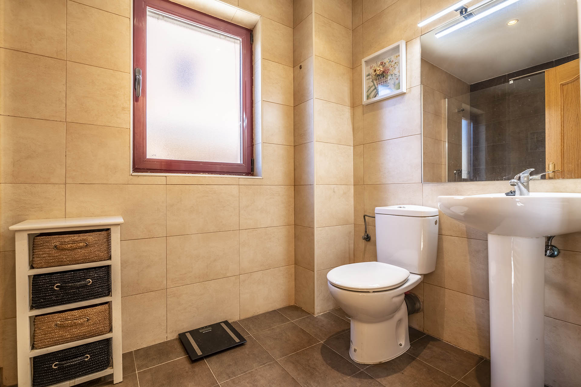 La carpintería es de aluminio lacado, con rotura de puente térmico y aperturas oscilobatientes. El acristalamiento es con vidrio Climalit 4/10/4. Persianas de aluminio con aislamiento térmico.