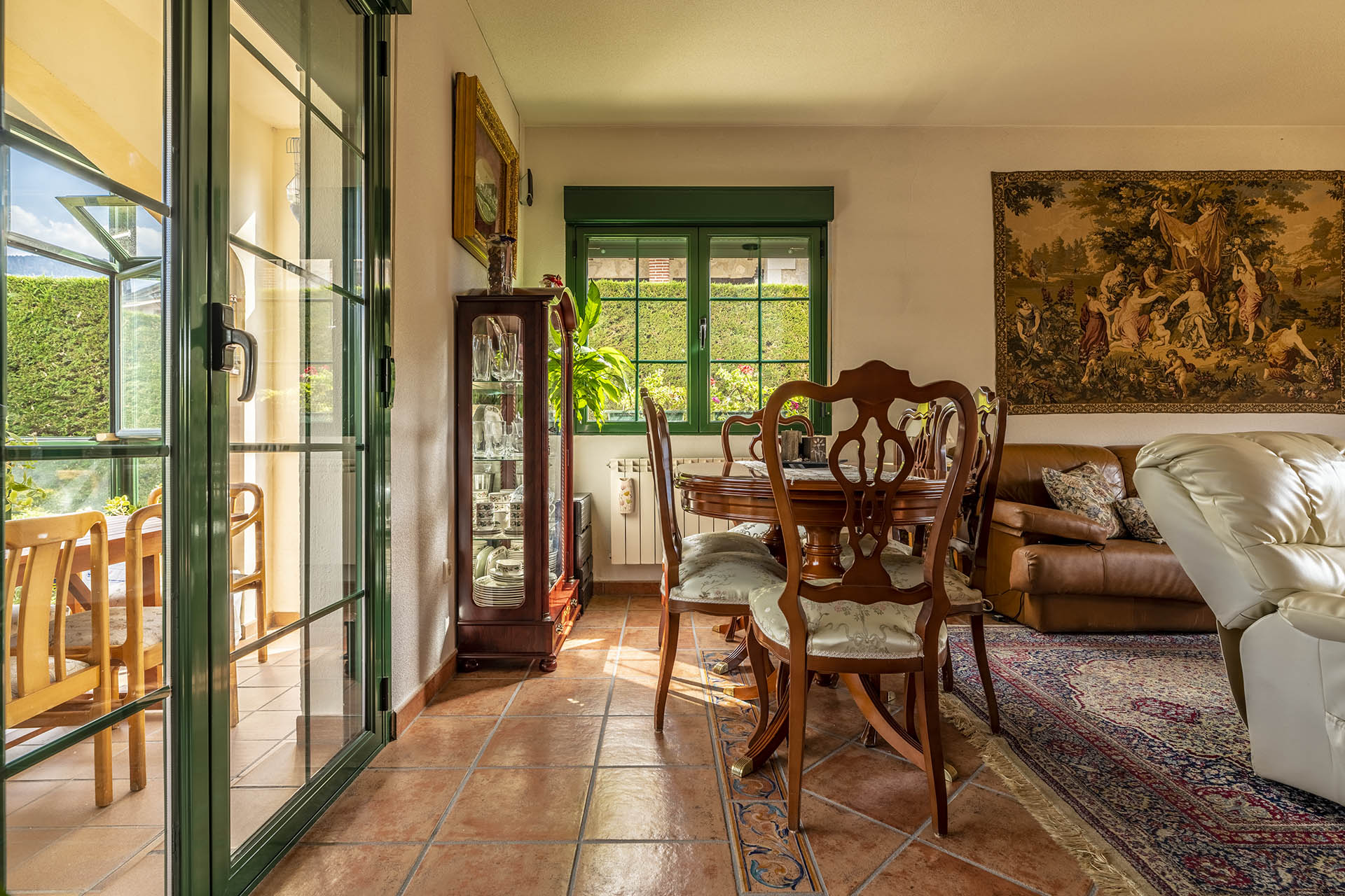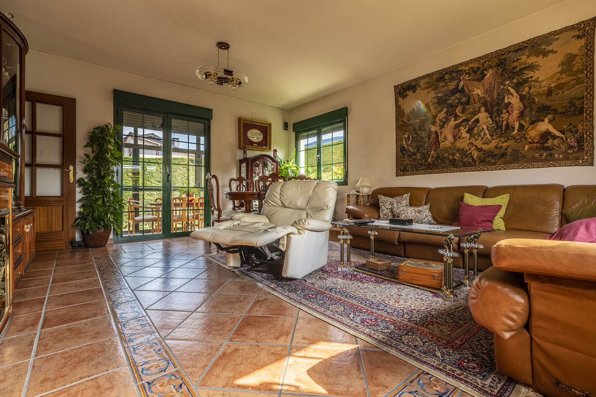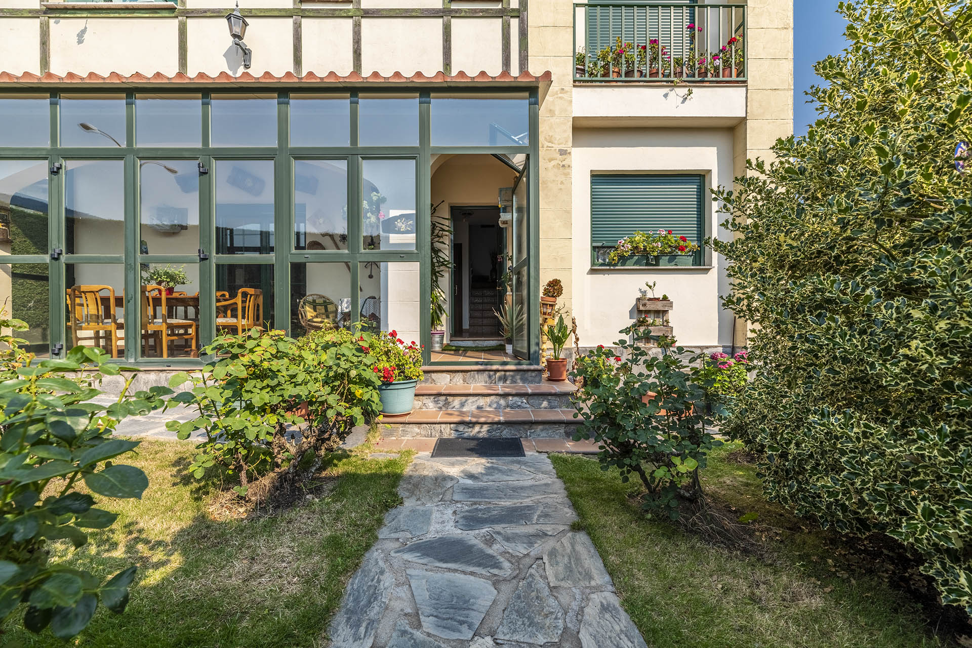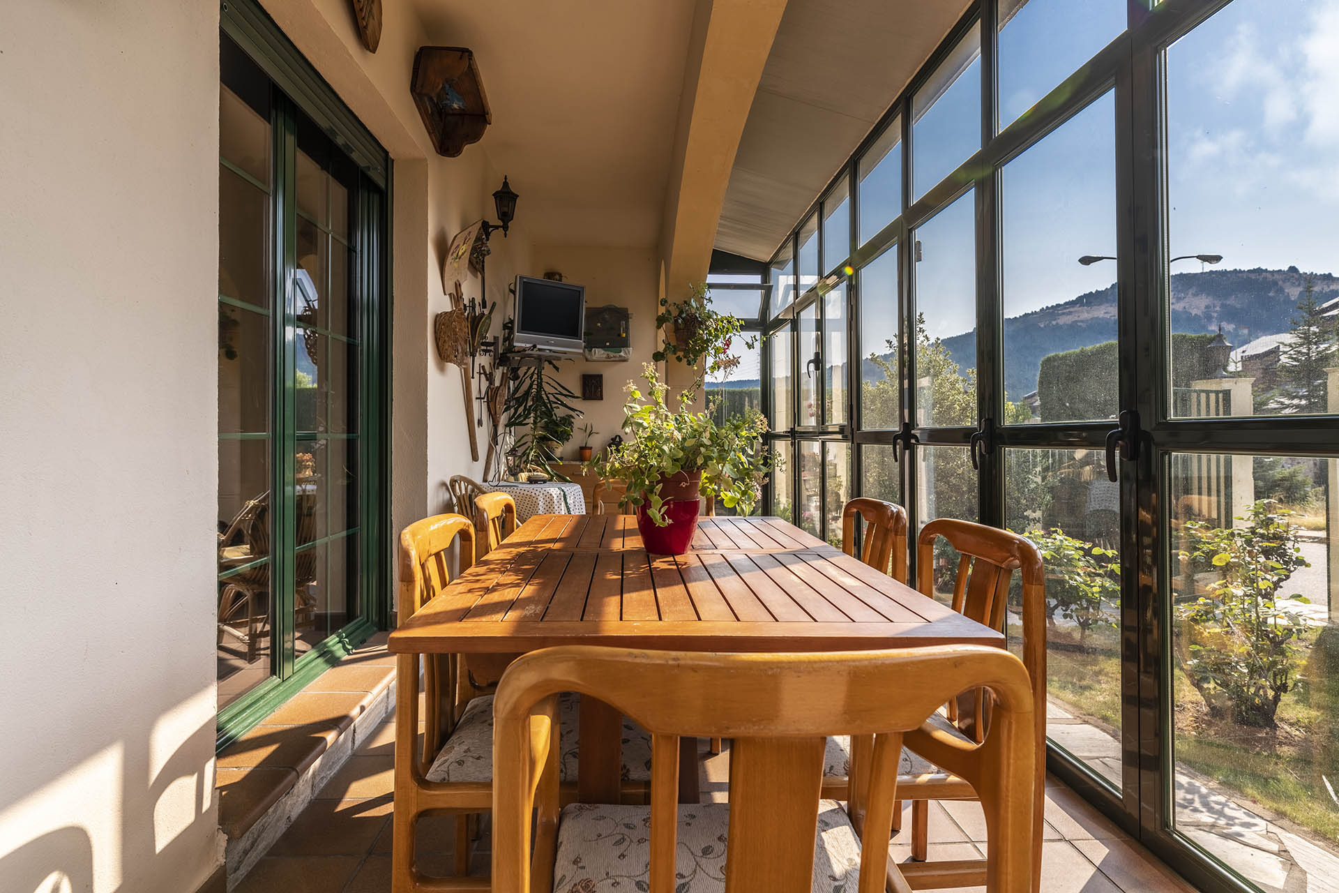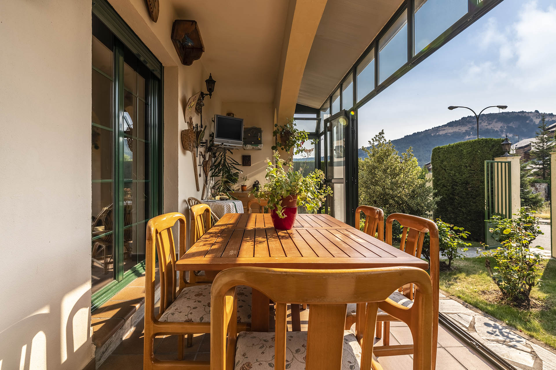 Si accedemos por la entrada frontal y principal de la vivienda, nos encontramos un bonito paseo de rosales y plantas consolidadas que da acceso a su espectacular terraza acristalada y practicable al 70% con vistas a la montaña, la cual nos adentra en la vivienda. Desde ésta, podrás disfrutar de bonitos días de verano y de invierno. Una vez dentro en el recibidor, a la izquierda accedemos a un gran salón con numerosas ventanas y preciosas vistas a la montaña. Al otro lado del recibidor tenemos acceso a una acogedora sala de estar que está comunicada mediante una ventana de servicio con la cocina. En esta planta tenemos un pequeño aseo de cortesía debajo del hueco de la escalera pero con altura suficiente para ponerse de pie.
