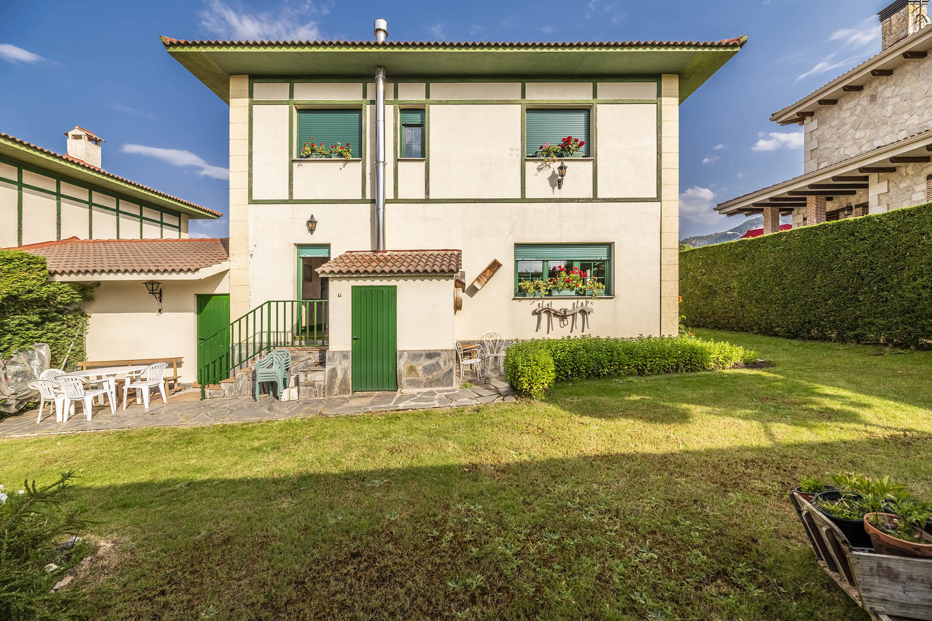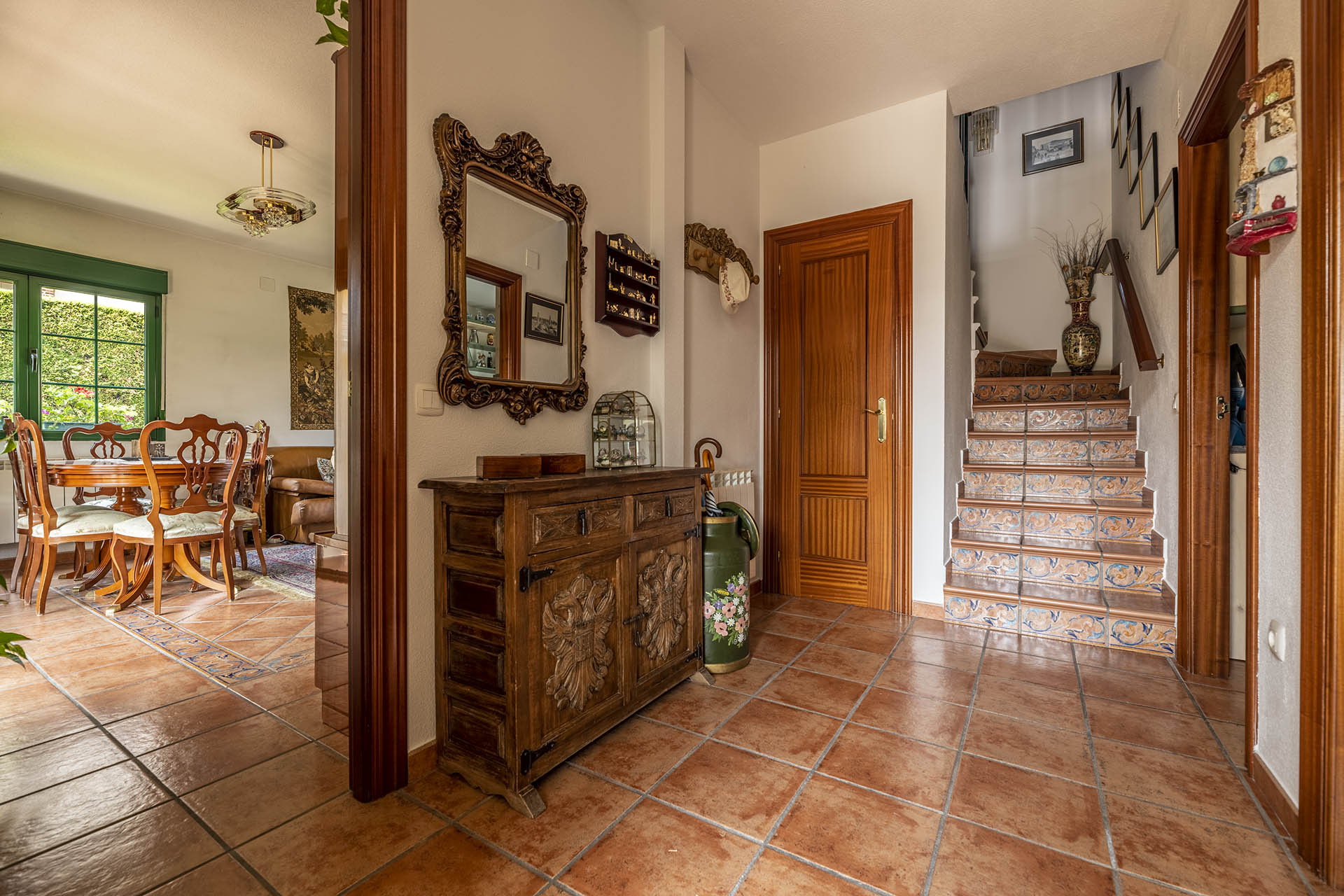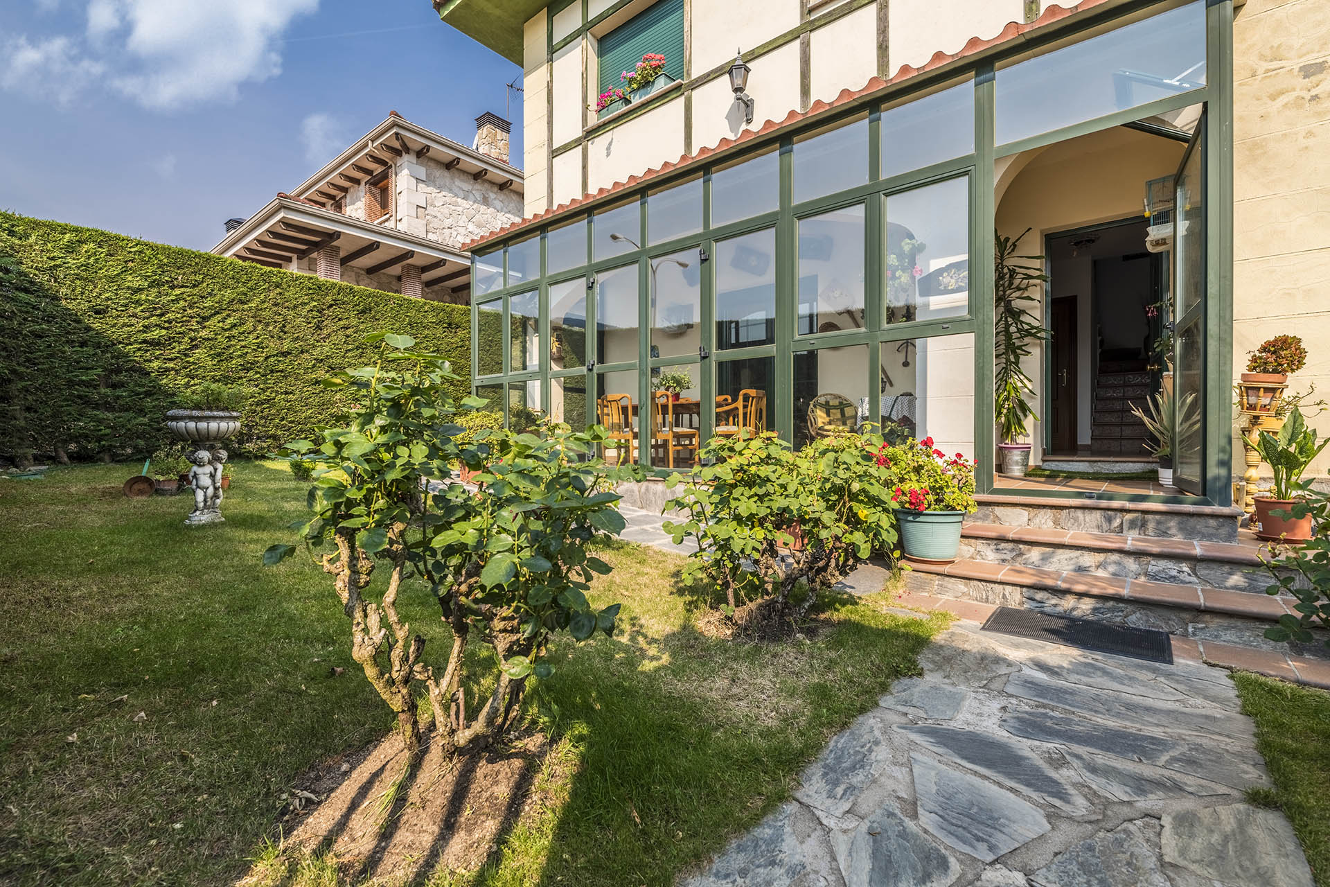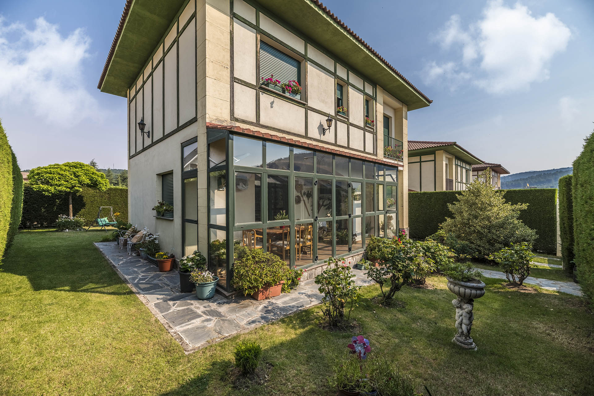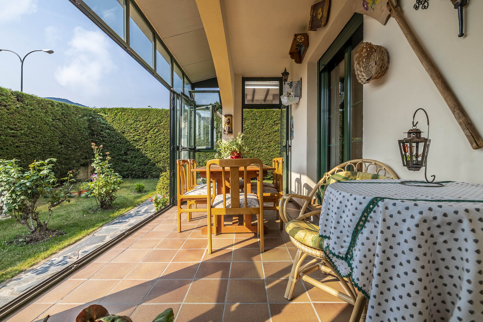 Si accedemos por la entrada frontal y principal de la vivienda, nos encontramos un bonito paseo de rosales y plantas consolidadas que da acceso a su espectacular terraza acristalada y practicable al 70% con vistas a la montaña, la cual nos adentra en la vivienda. Desde ésta, podrás disfrutar de bonitos días de verano y de invierno. Una vez dentro en el recibidor, a la izquierda accedemos a un gran salón con numerosas ventanas y preciosas vistas a la montaña. Al otro lado del recibidor tenemos acceso a una acogedora sala de estar que está comunicada mediante una ventana de servicio con la cocina. En esta planta tenemos un pequeño aseo de cortesía debajo del hueco de la escalera pero con altura suficiente para ponerse de pie.