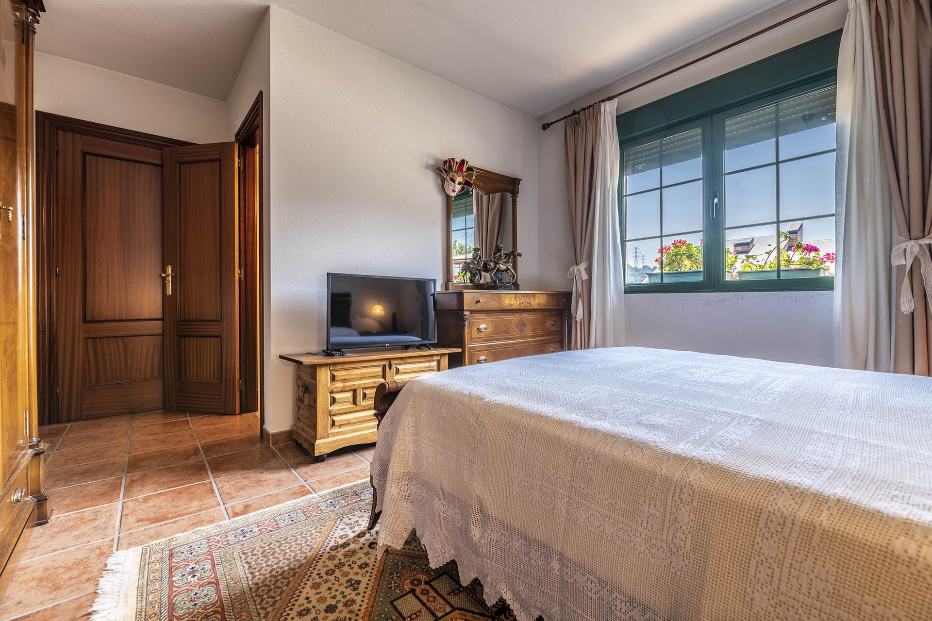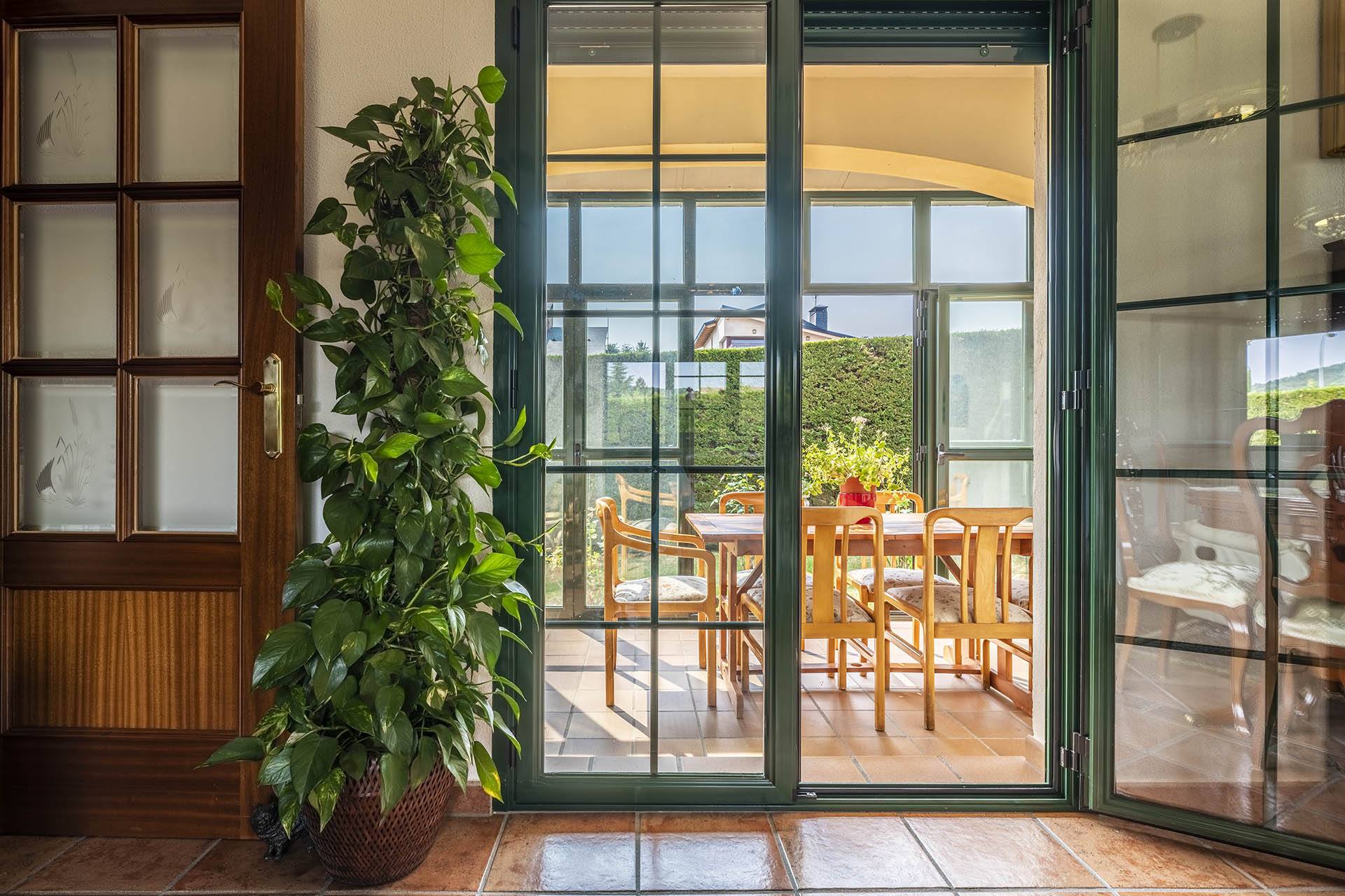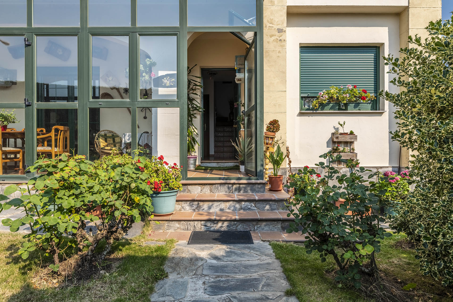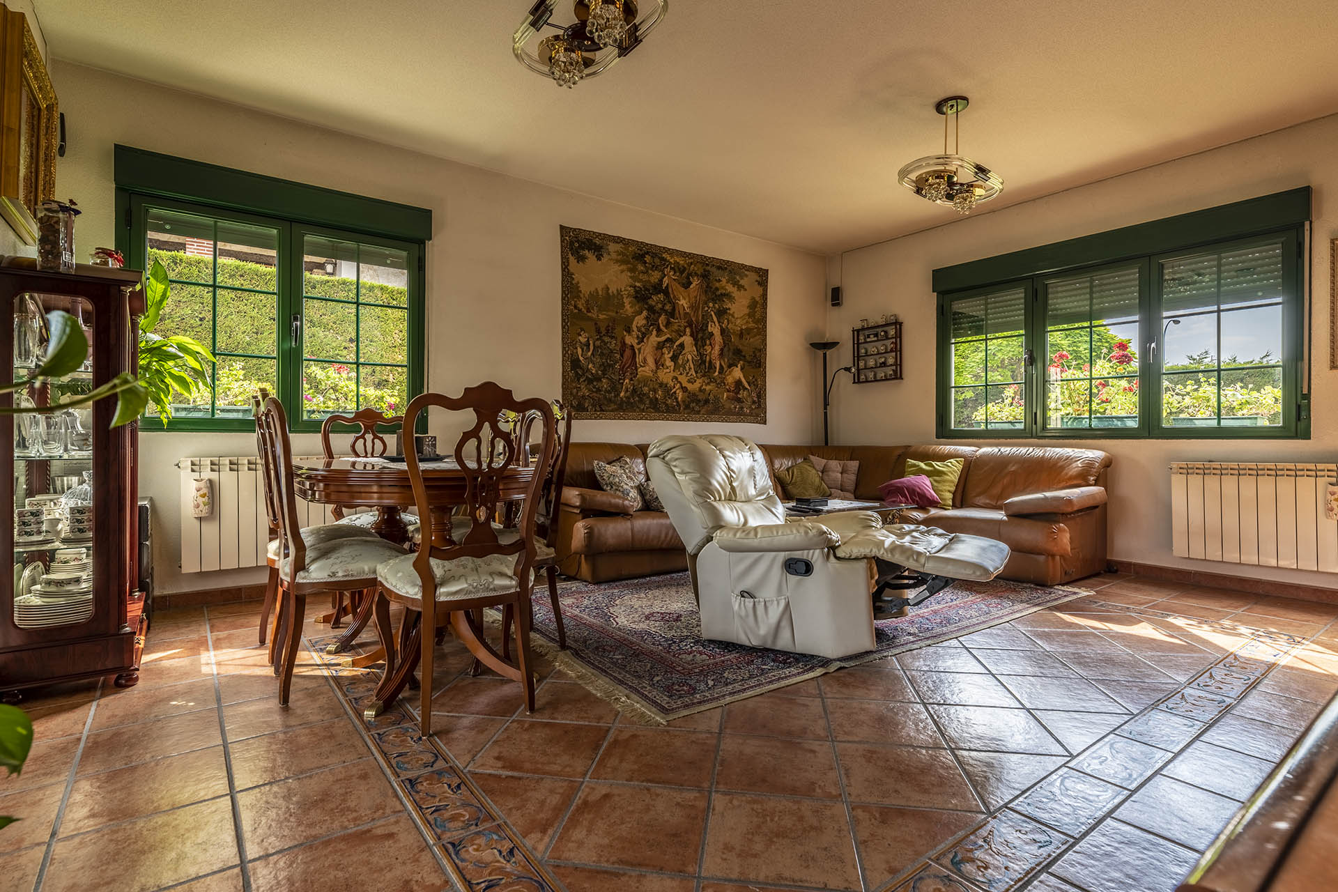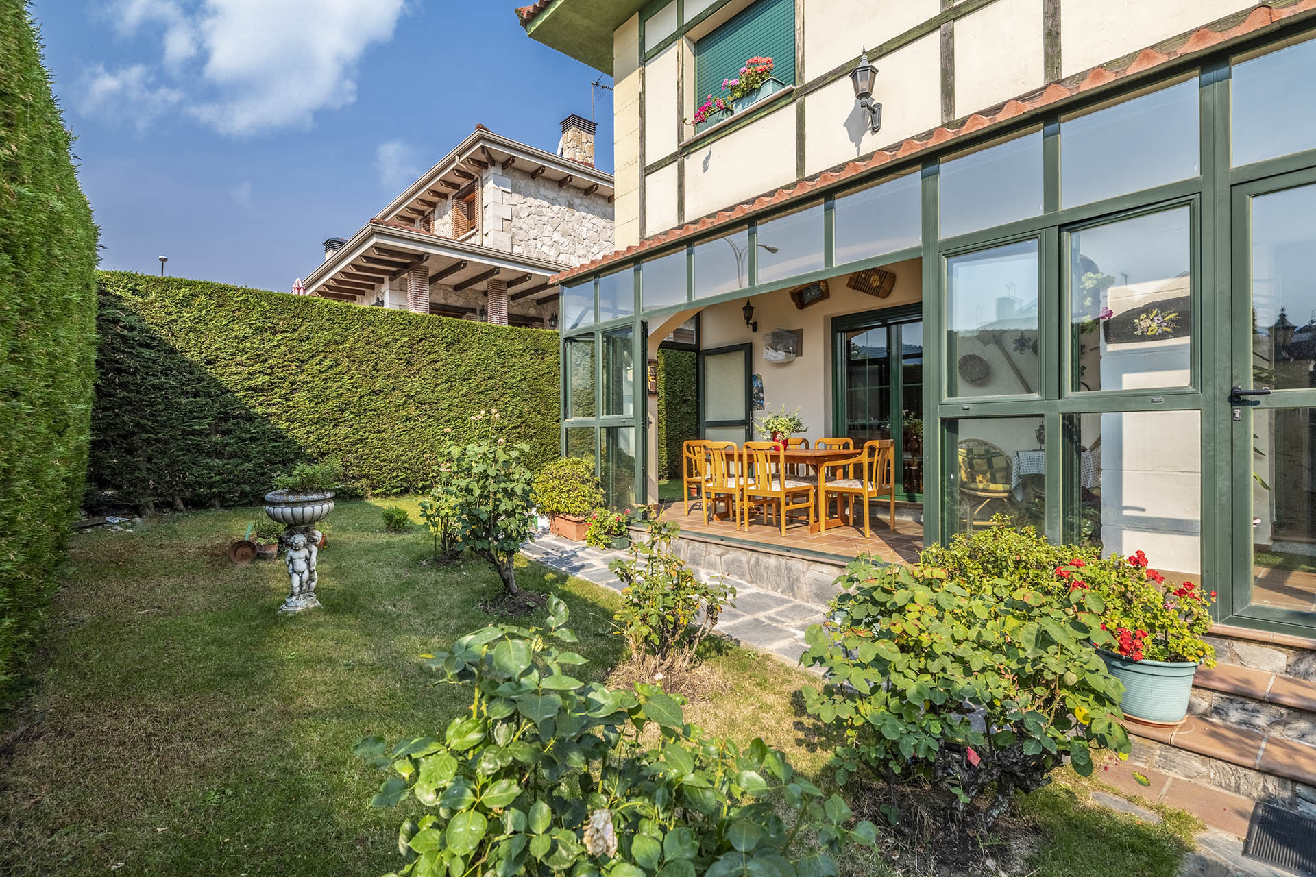 Si accedemos por la entrada frontal y principal de la vivienda, nos encontramos un bonito paseo de rosales y plantas consolidadas que da acceso a su espectacular terraza acristalada y practicable al 70% con vistas a la montaña, la cual nos adentra en la vivienda. Desde ésta, podrás disfrutar de bonitos días de verano y de invierno. Una vez dentro en el recibidor, a la izquierda accedemos a un gran salón con numerosas ventanas y preciosas vistas a la montaña. Al otro lado del recibidor tenemos acceso a una acogedora sala de estar que está comunicada mediante una ventana de servicio con la cocina. En esta planta tenemos un pequeño aseo de cortesía debajo del hueco de la escalera pero con altura suficiente para ponerse de pie.
