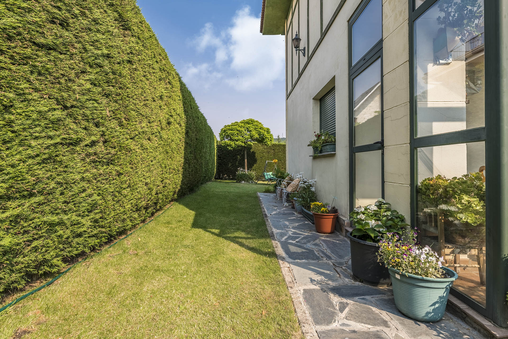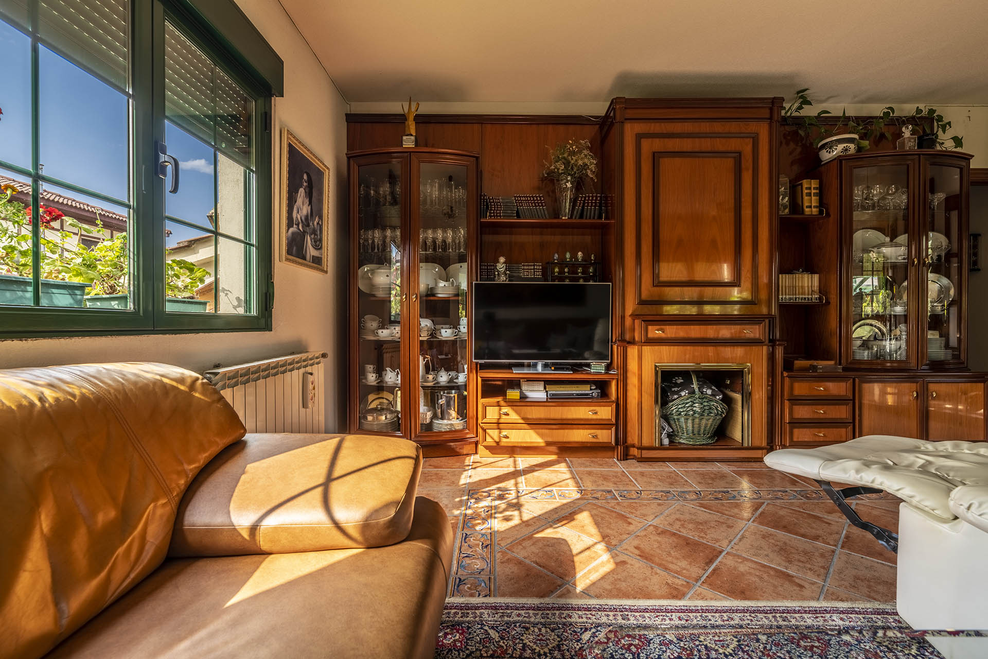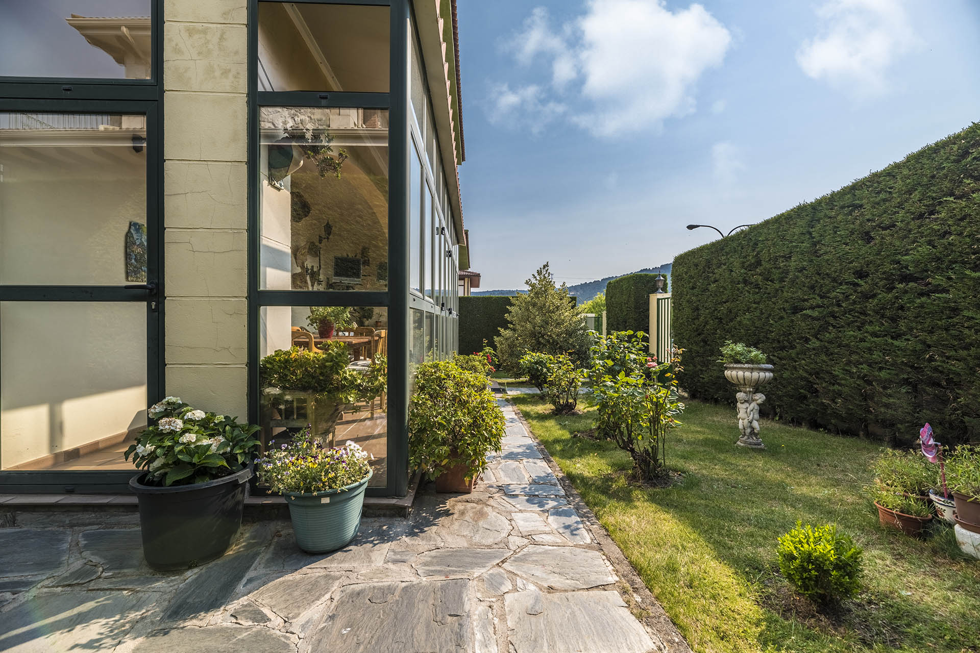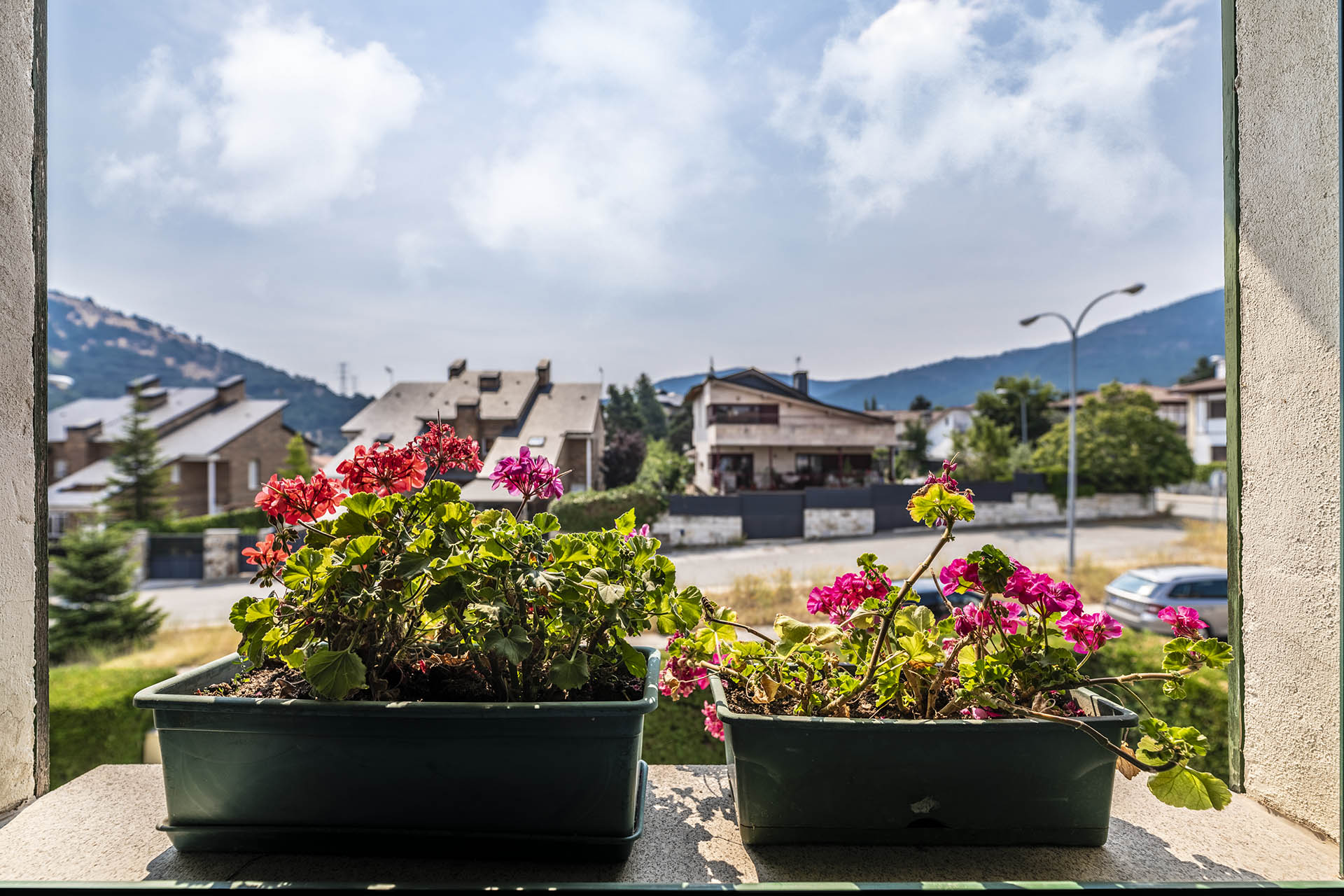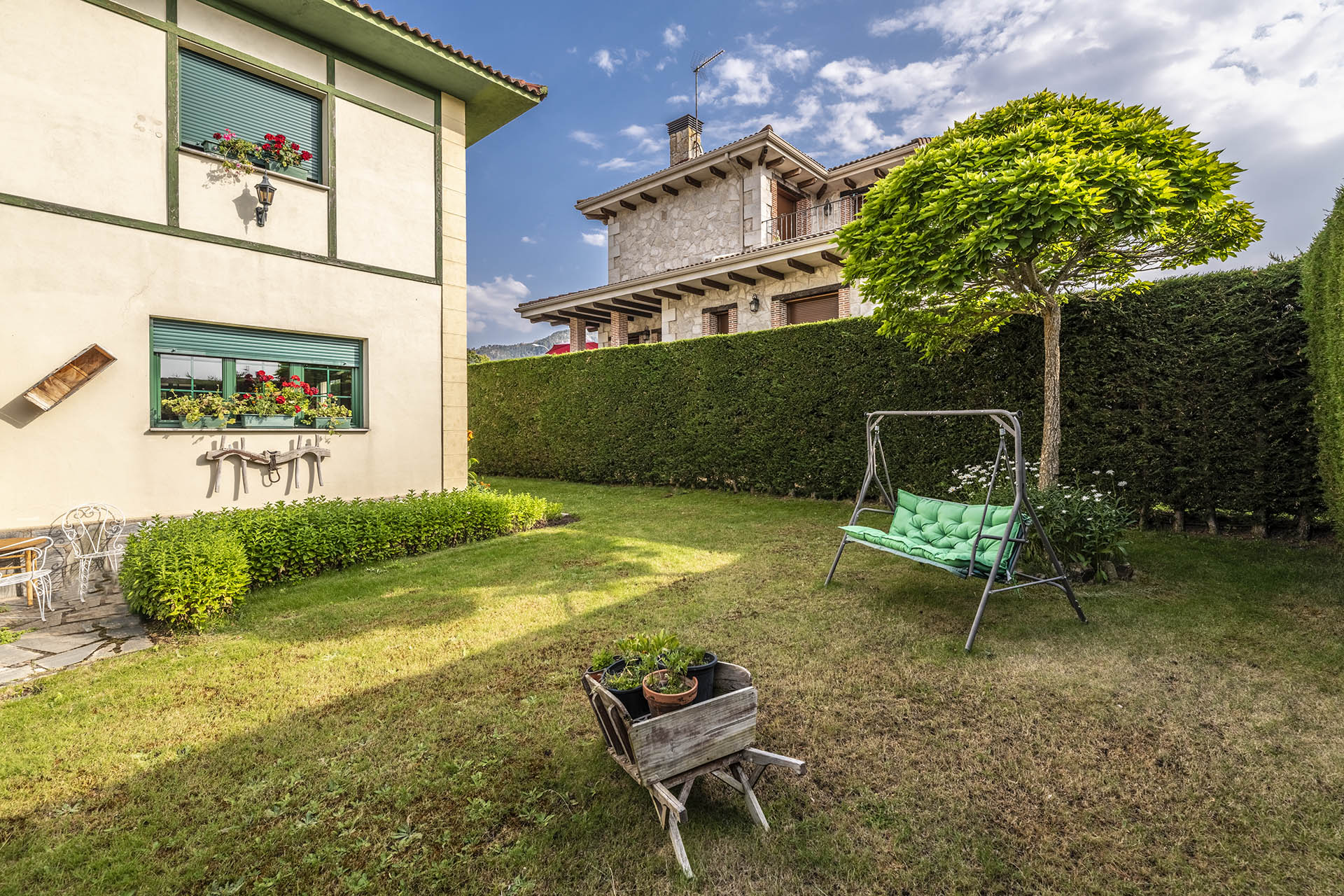 Si accedemos por la entrada frontal y principal de la vivienda, nos encontramos un bonito paseo de rosales y plantas consolidadas que da acceso a su espectacular terraza acristalada y practicable al 70% con vistas a la montaña, la cual nos adentra en la vivienda. Desde ésta, podrás disfrutar de bonitos días de verano y de invierno. Una vez dentro en el recibidor, a la izquierda accedemos a un gran salón con numerosas ventanas y preciosas vistas a la montaña. Al otro lado del recibidor tenemos acceso a una acogedora sala de estar que está comunicada mediante una ventana de servicio con la cocina. En esta planta tenemos un pequeño aseo de cortesía debajo del hueco de la escalera pero con altura suficiente para ponerse de pie.