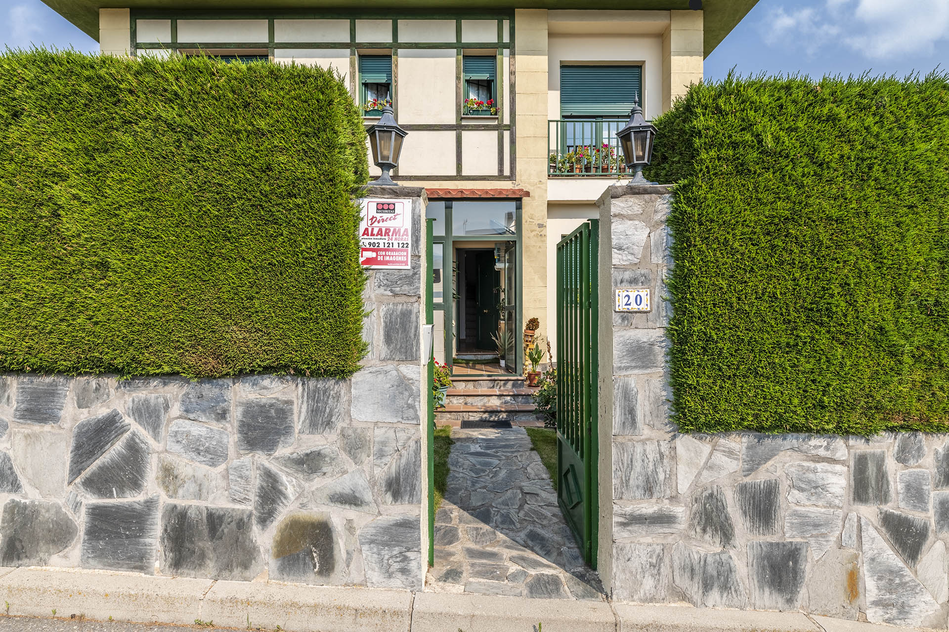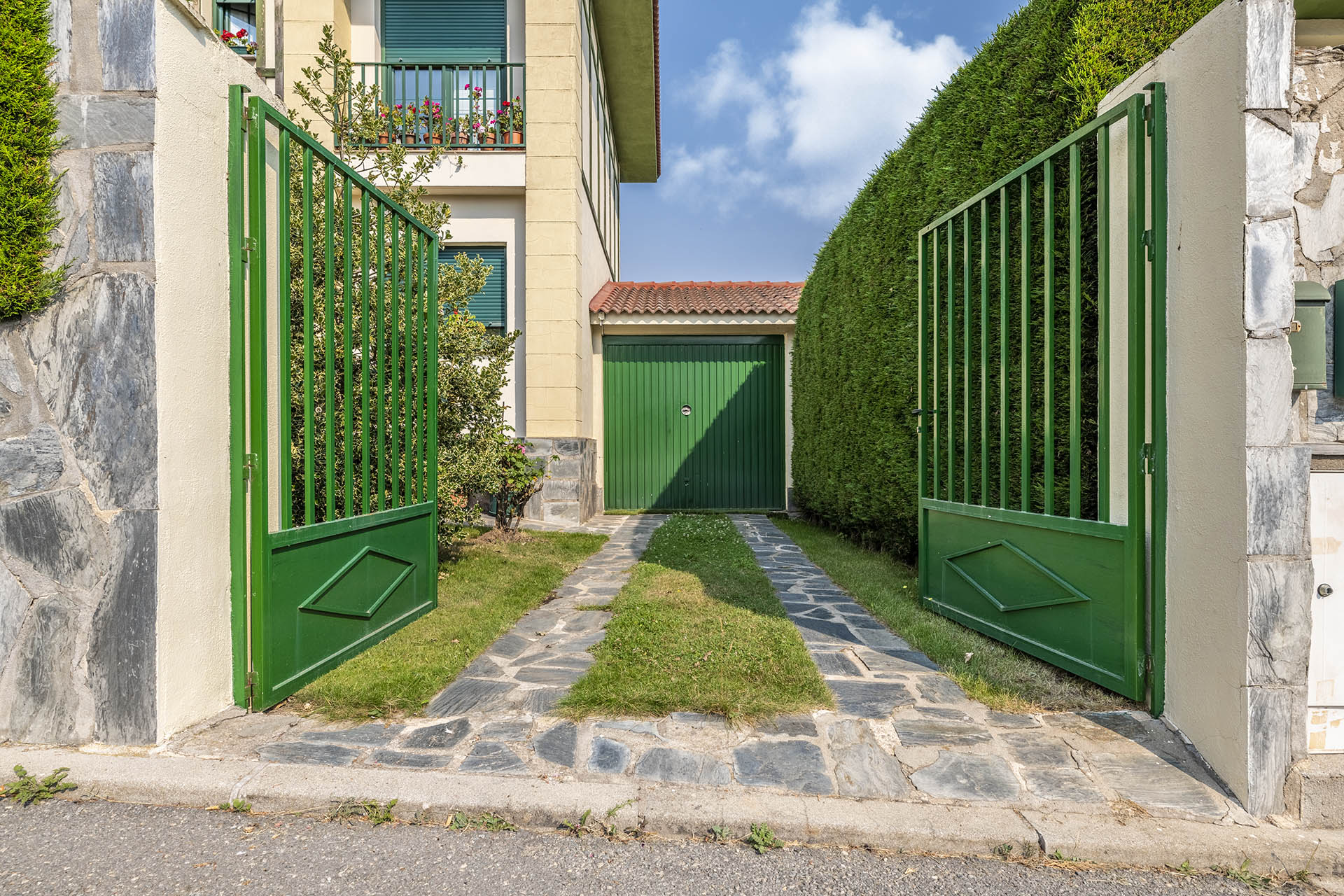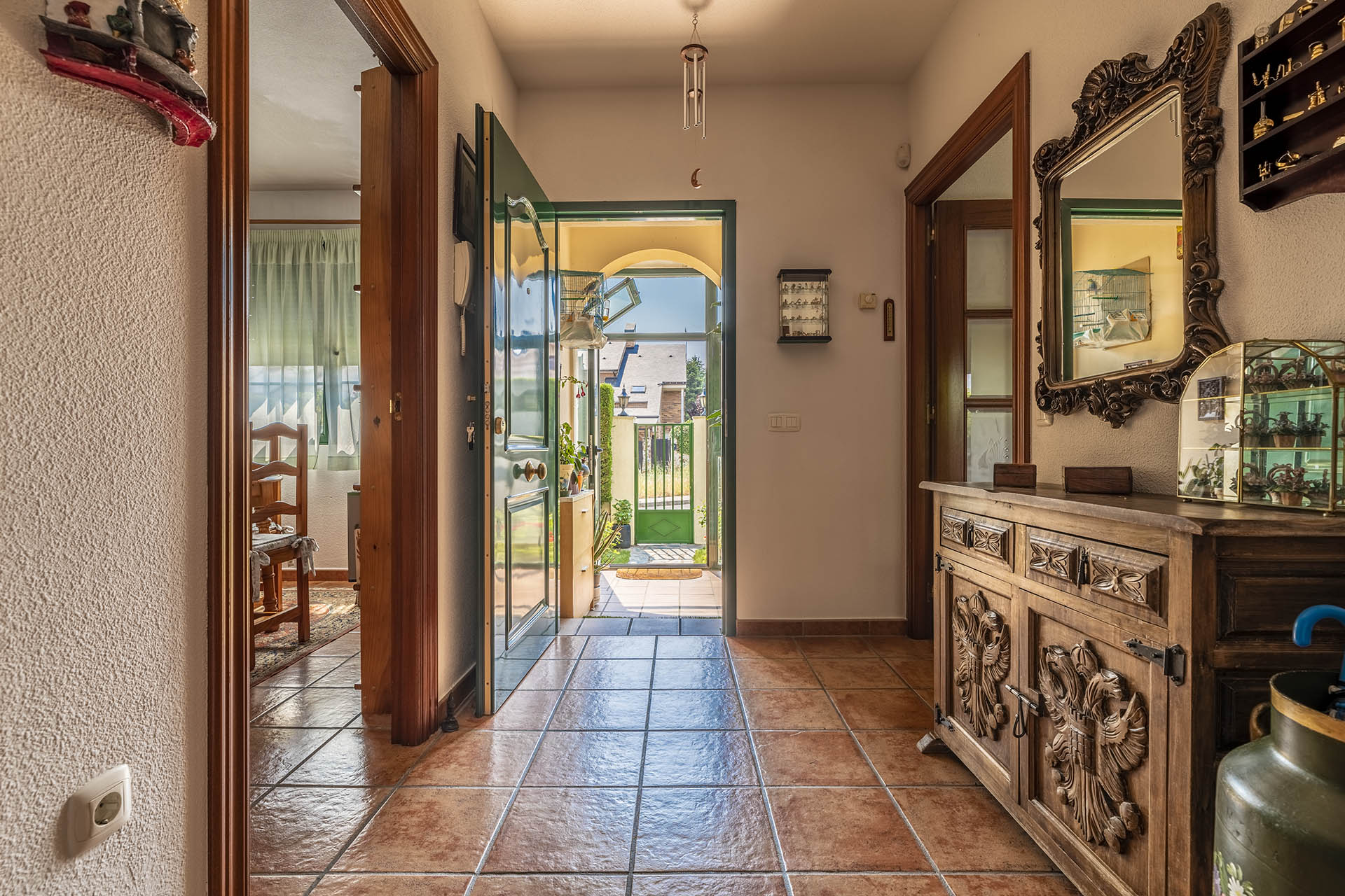 La vivienda posee dos accesos, el principal y otro a través de la cocina, éste último comunica con el jardín principal.