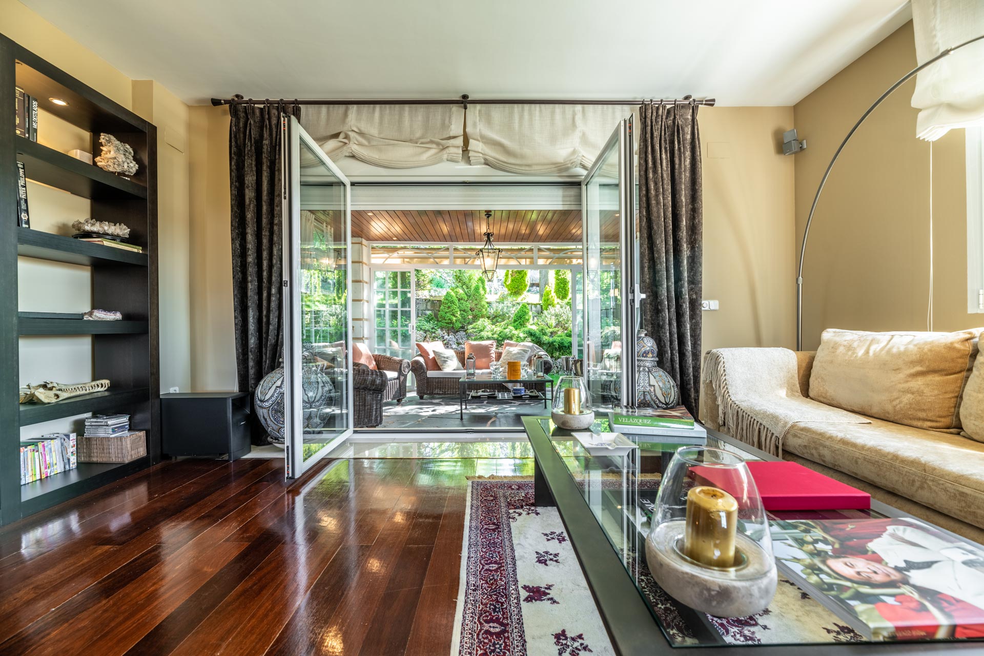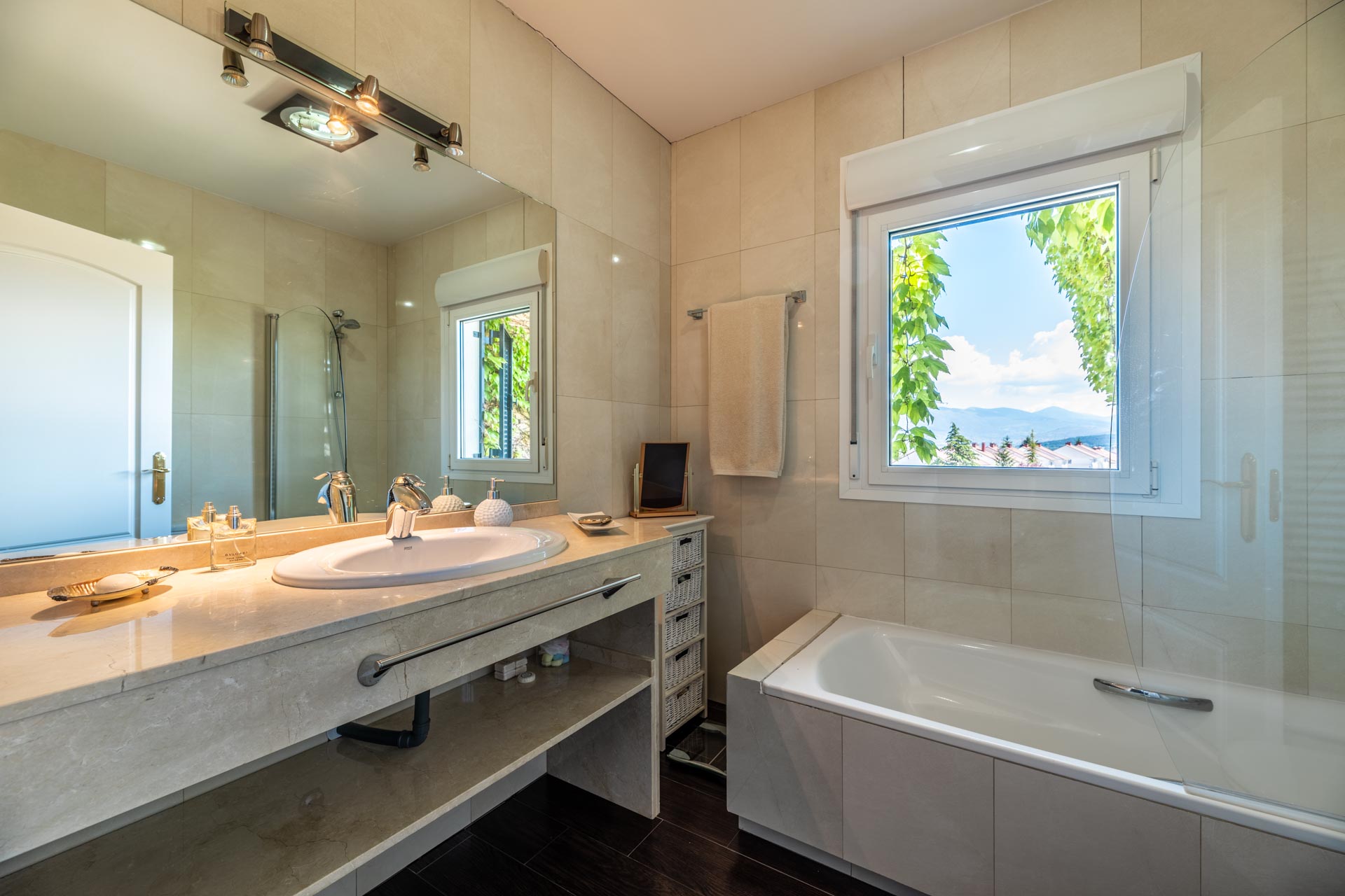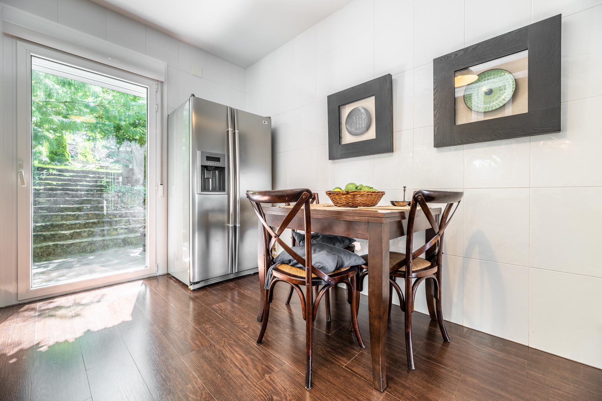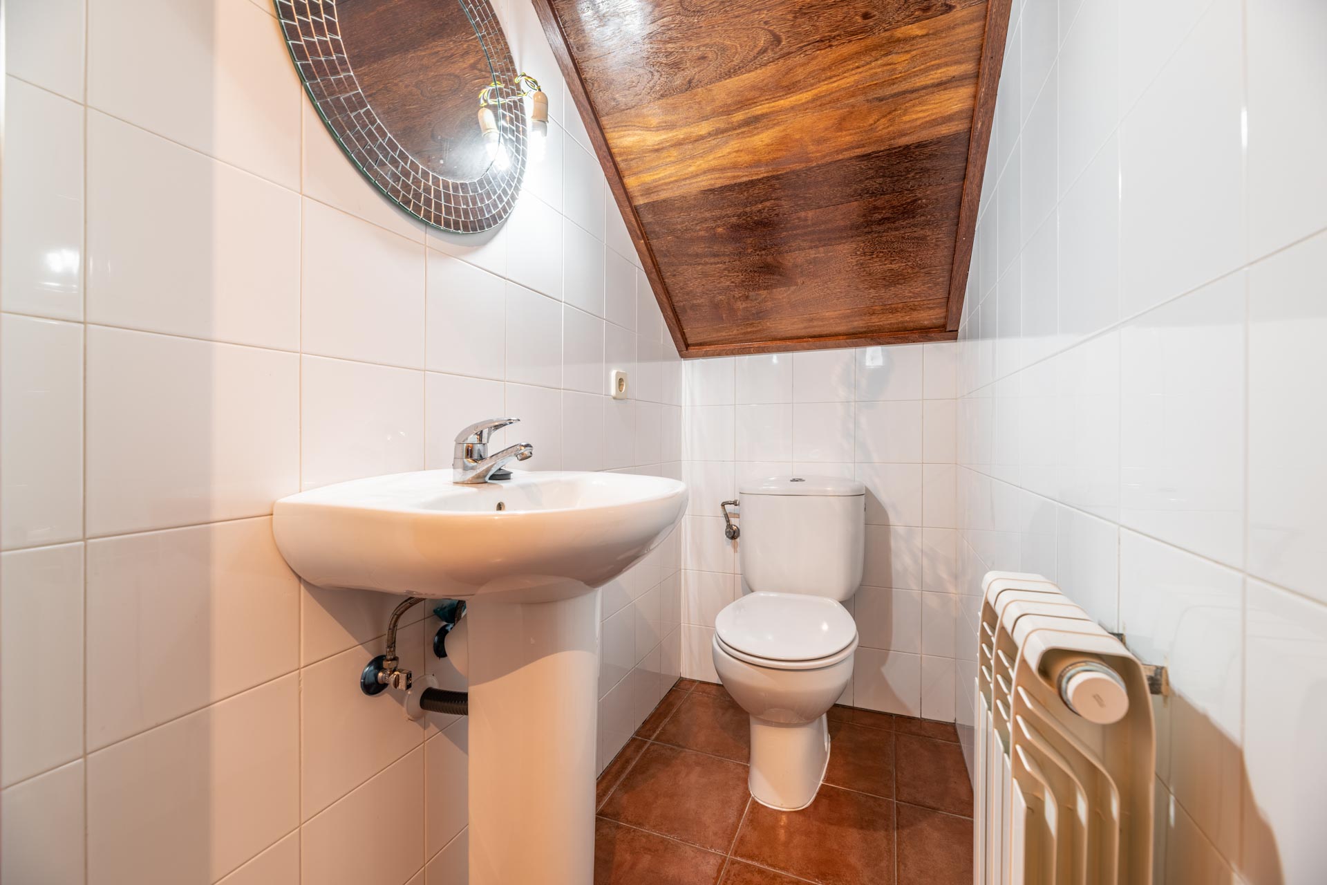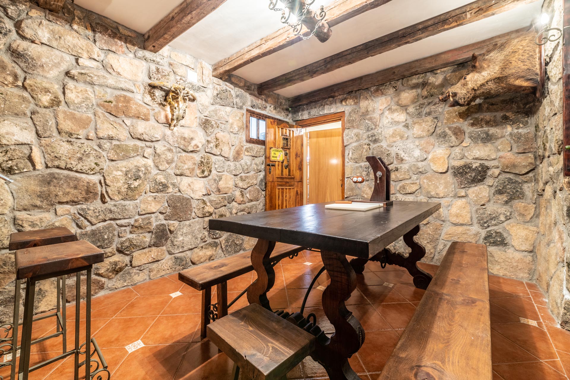 En la primera planta sobre rasante nos encontramos un recibidor que da acceso a uno de los dormitorios, actualmente usado como despacho, al baño de cortesía de estilo minimalista, cocina y salón. Una cocina espaciosa y totalmente equipada, con agradables vistas al jardín. El salón-comedor posee una de la famosas chimeneas anteriormente mencionadas, de estilo moderno y una de las joyas de la casa. El salón es de amplias dimensiones y con acceso directo al porche cubierto, que a su vez, es totalmente practicable. Un porche, que muy probablemente, será el lugar habitual de reuniones familiares y/o amigos. En éste podréis disfrutar del sonido relajante de la vegetación de la vivienda y de la propia montaña, así como del trinar de los pájaros y otras especies autóctonas.