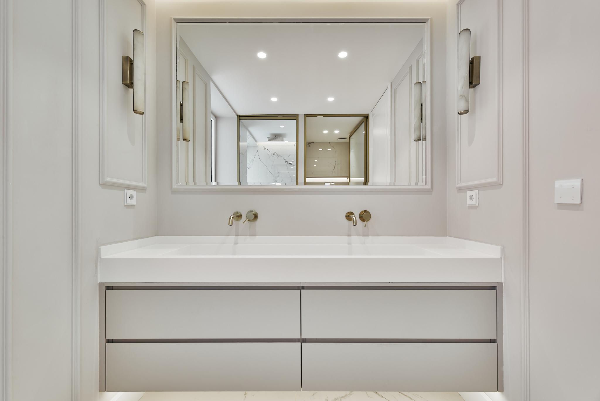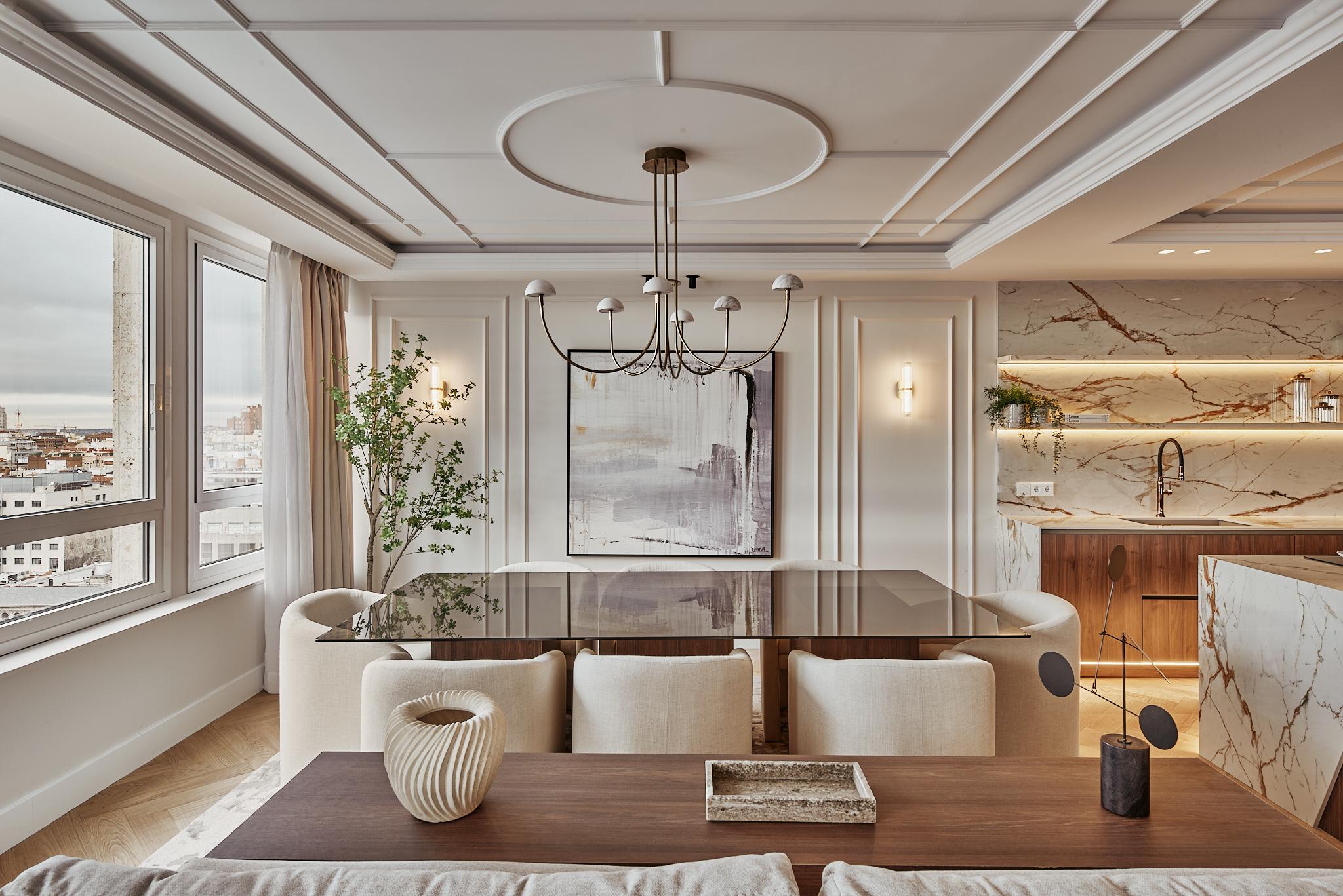 Con 339 m², recién reformado en una planta 13ª, la propiedad se despliega con una sensación inmediata de espacio, equilibrio y calma. Cada estancia ha sido concebida para potenciar la entrada de luz natural y poner en valor la pureza de los materiales, generando una atmósfera sofisticada y acogedora a la vez, difícil de encontrar en el centro de Madrid.