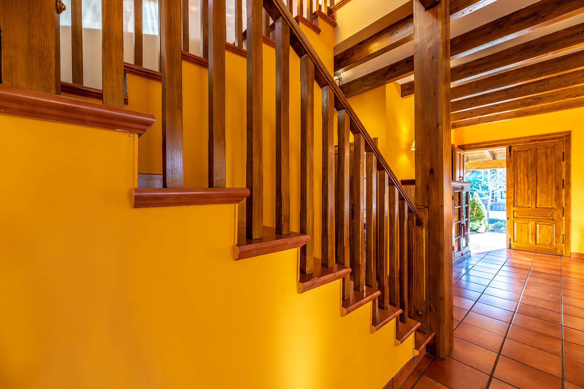 Una vez entramos por la puerta principal de la vivienda, nos encontramos un inmenso salón de nada más y nada menos que 55 m2. En éste tenemos desde una zona de relax frente a la chimenea, una zona de comedor, o un mirador donde sentarse a tomar un café, mientras se lee un periódico o un libro. Al fondo, nos encontramos el acceso al Dormitorio principal de la vivienda con su baño en suite.