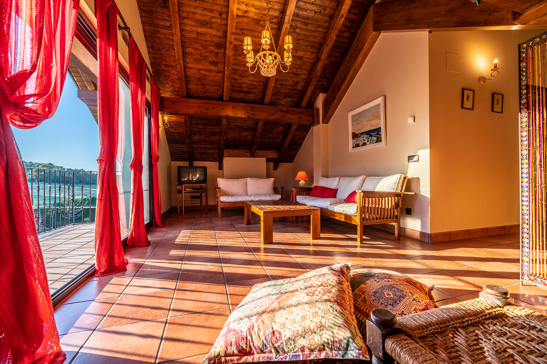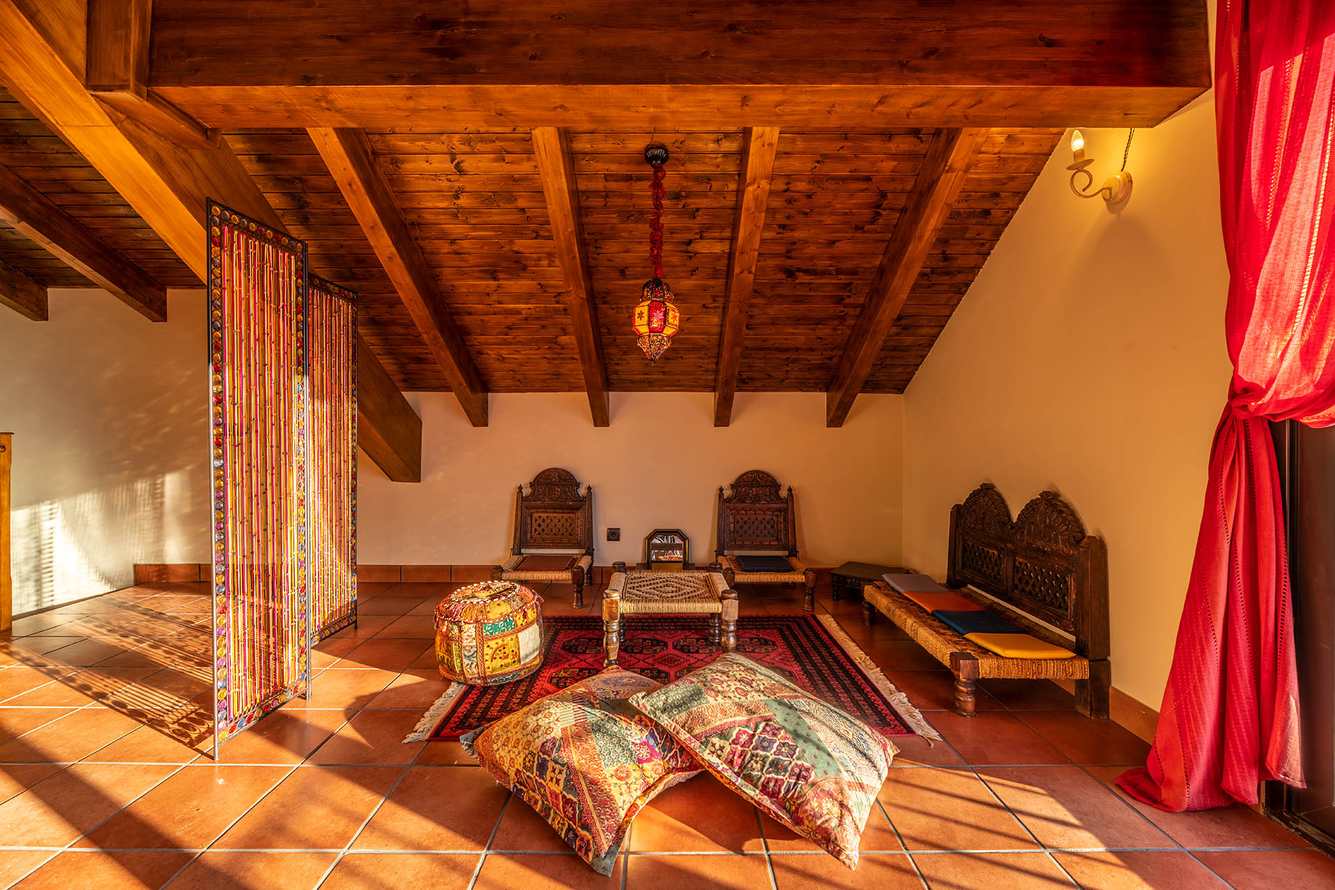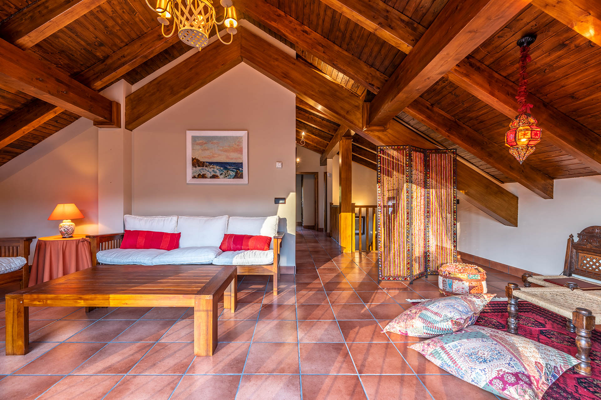Lo primero que nos llama la atención al subir a la planta 1 son sus increíbles techos abuhardillados con madera de Iroko. Una vez arriba nos encontramos con otro gran salón de unos 45 m2. Este nos da acceso al balcón con vistas a la montaña. También encontramos una zona de ambiente morisco, donde sentarnos informalmente a tomarnos unas pastas o un té con amigos.