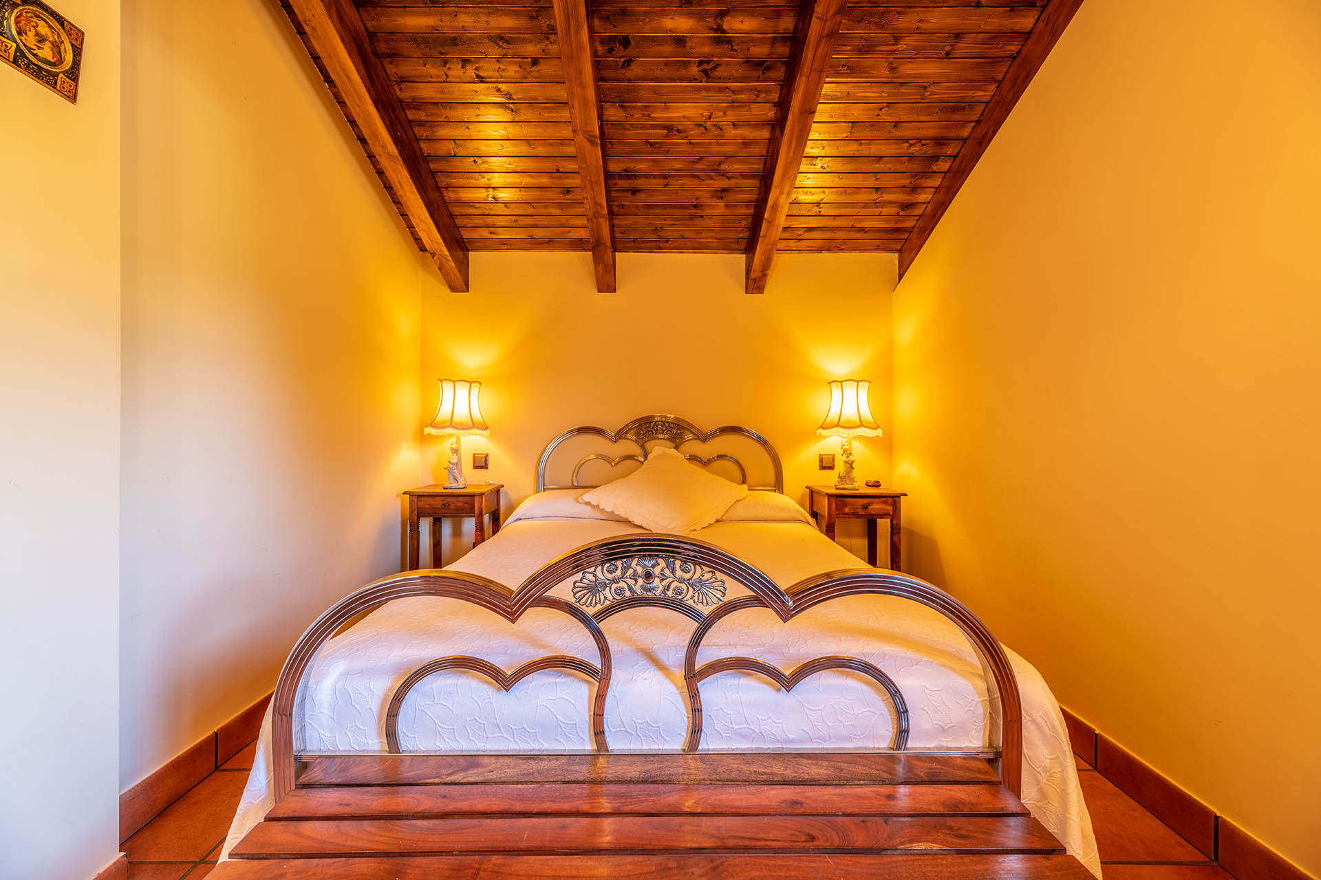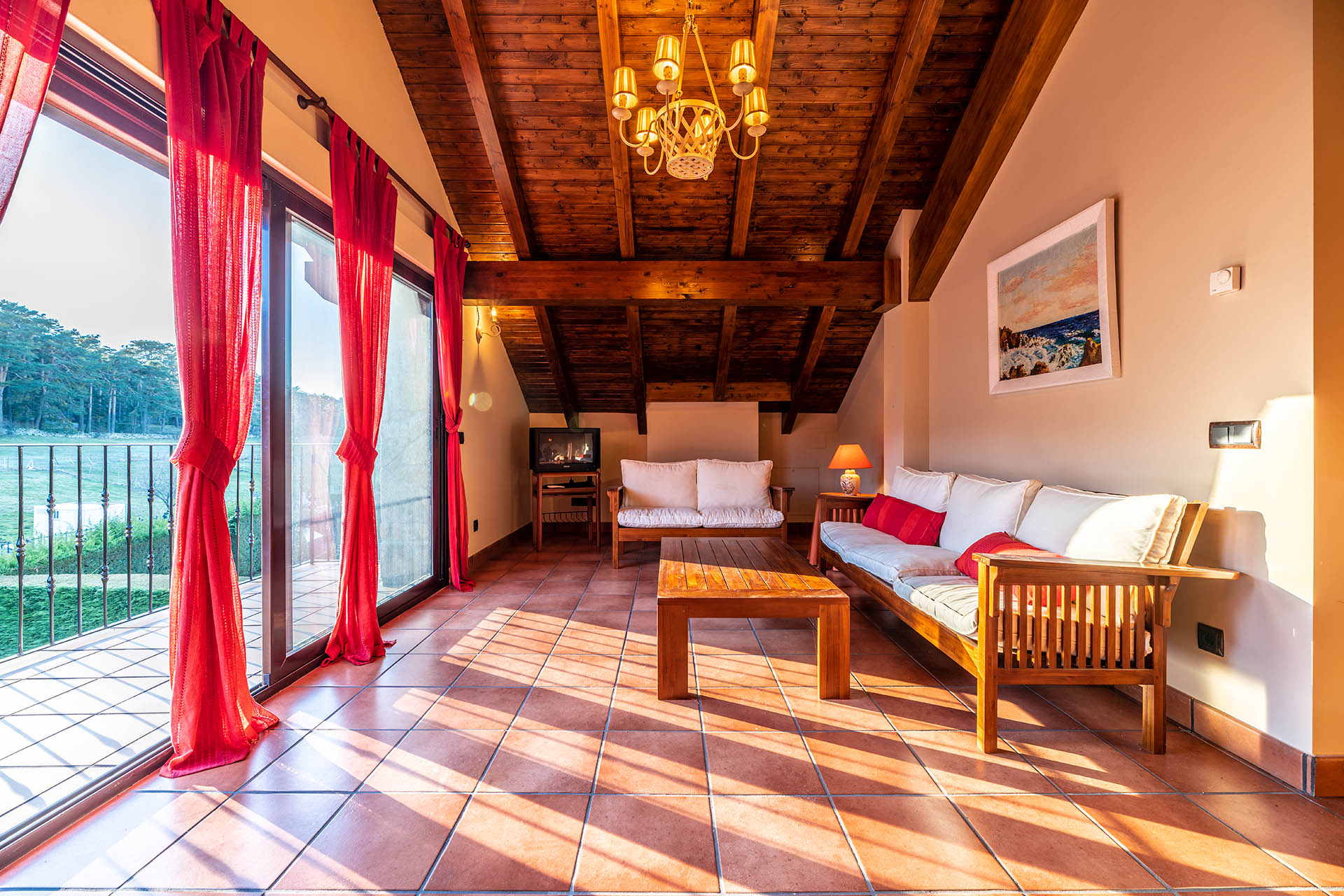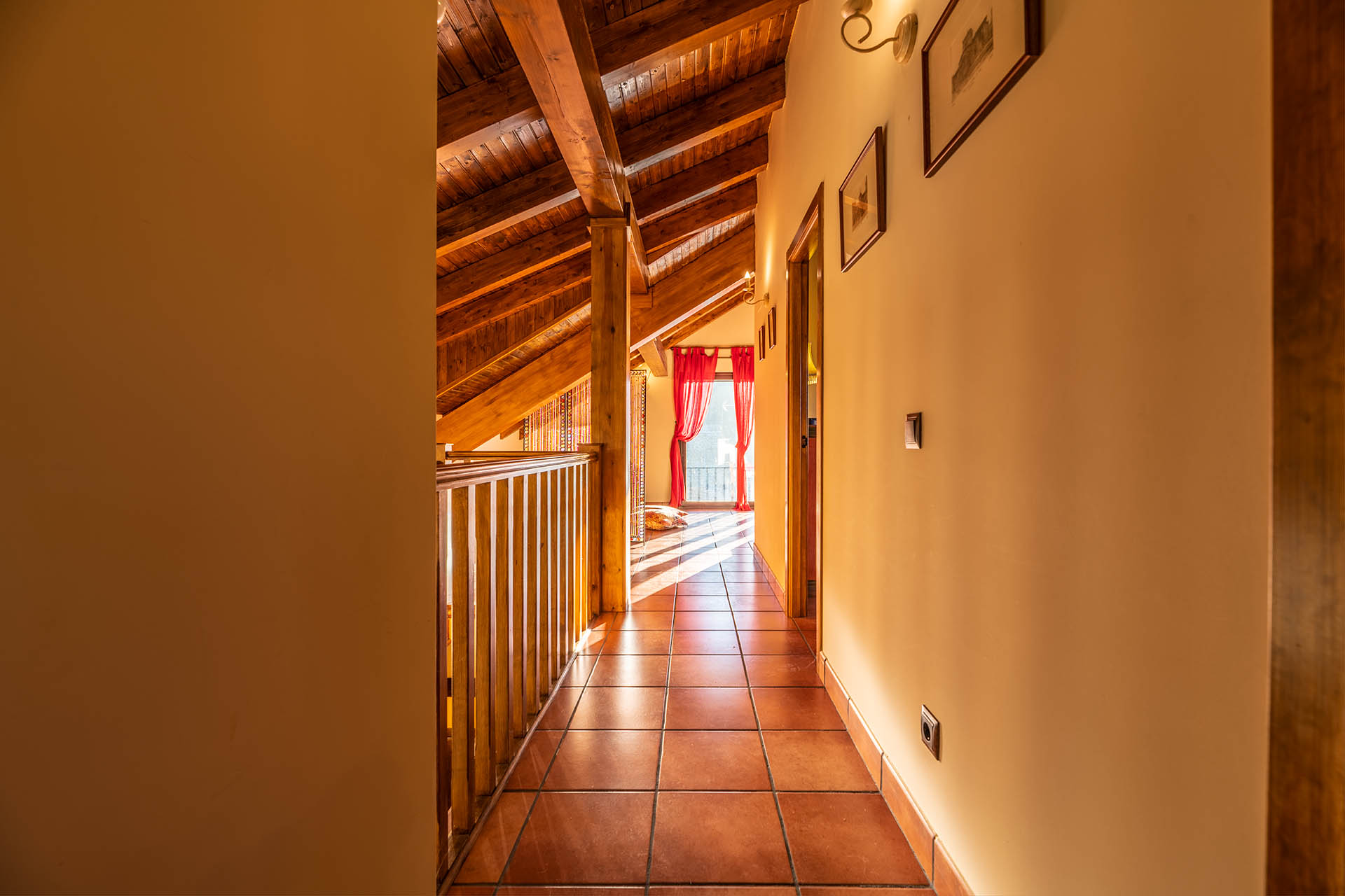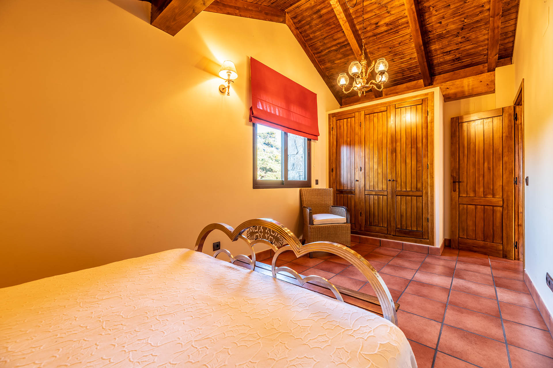 Lo primero que nos llama la atención al subir a la planta 1 son sus increíbles techos abuhardillados con madera de Iroko. Una vez arriba nos encontramos con otro gran salón de unos 45 m2. Este nos da acceso al balcón con vistas a la montaña. También encontramos una zona de ambiente morisco, donde sentarnos informalmente a tomarnos unas pastas o un té con amigos.